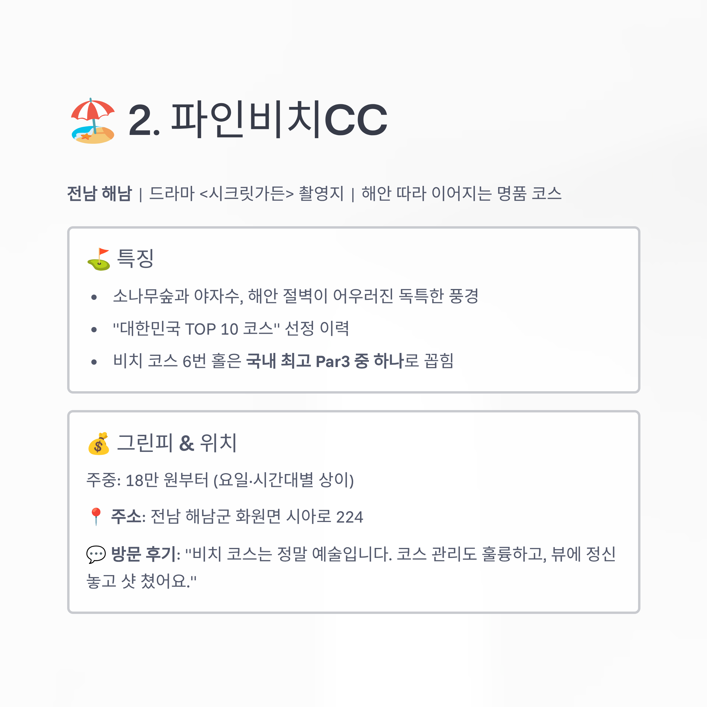 | 파인비치CC | 전남 해남 | 해안 절벽 따라 설계 | 18만 원~ | X | 명품 Par3 코스 |