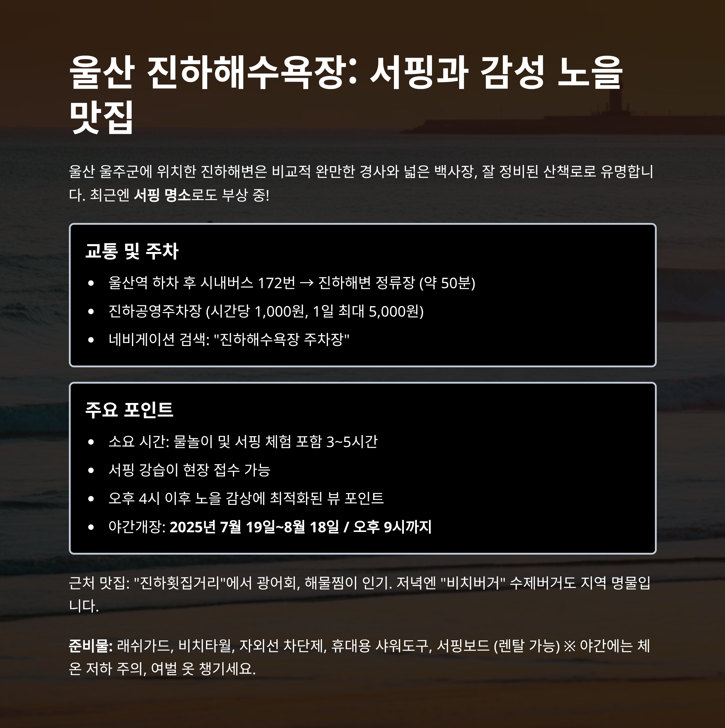 - 교통 팁: 울산역 하차 후 시내버스 172번 → 진하해변 정류장 (약 50분)