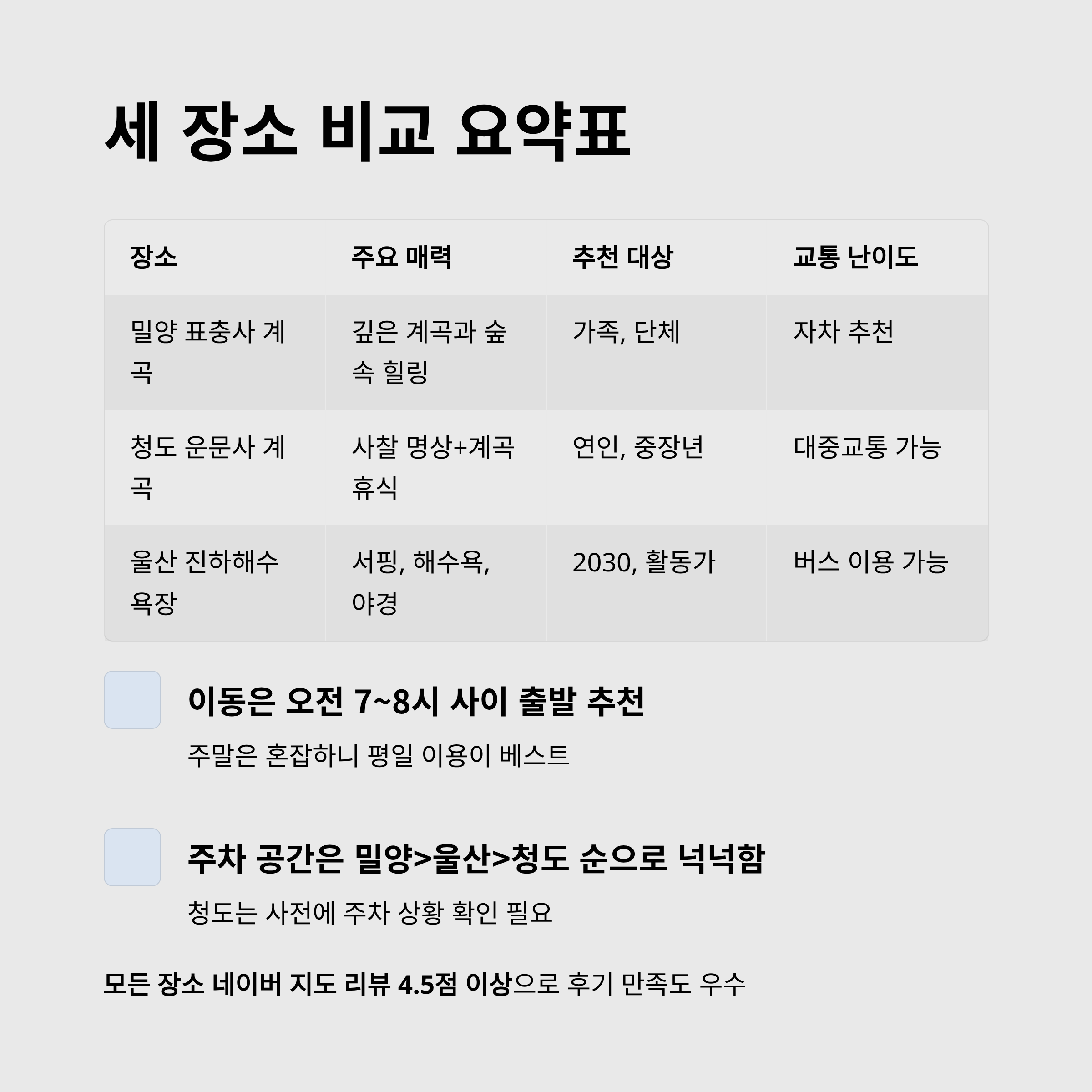 - 주차 공간은 밀양>울산>청도 순으로 넉넉함