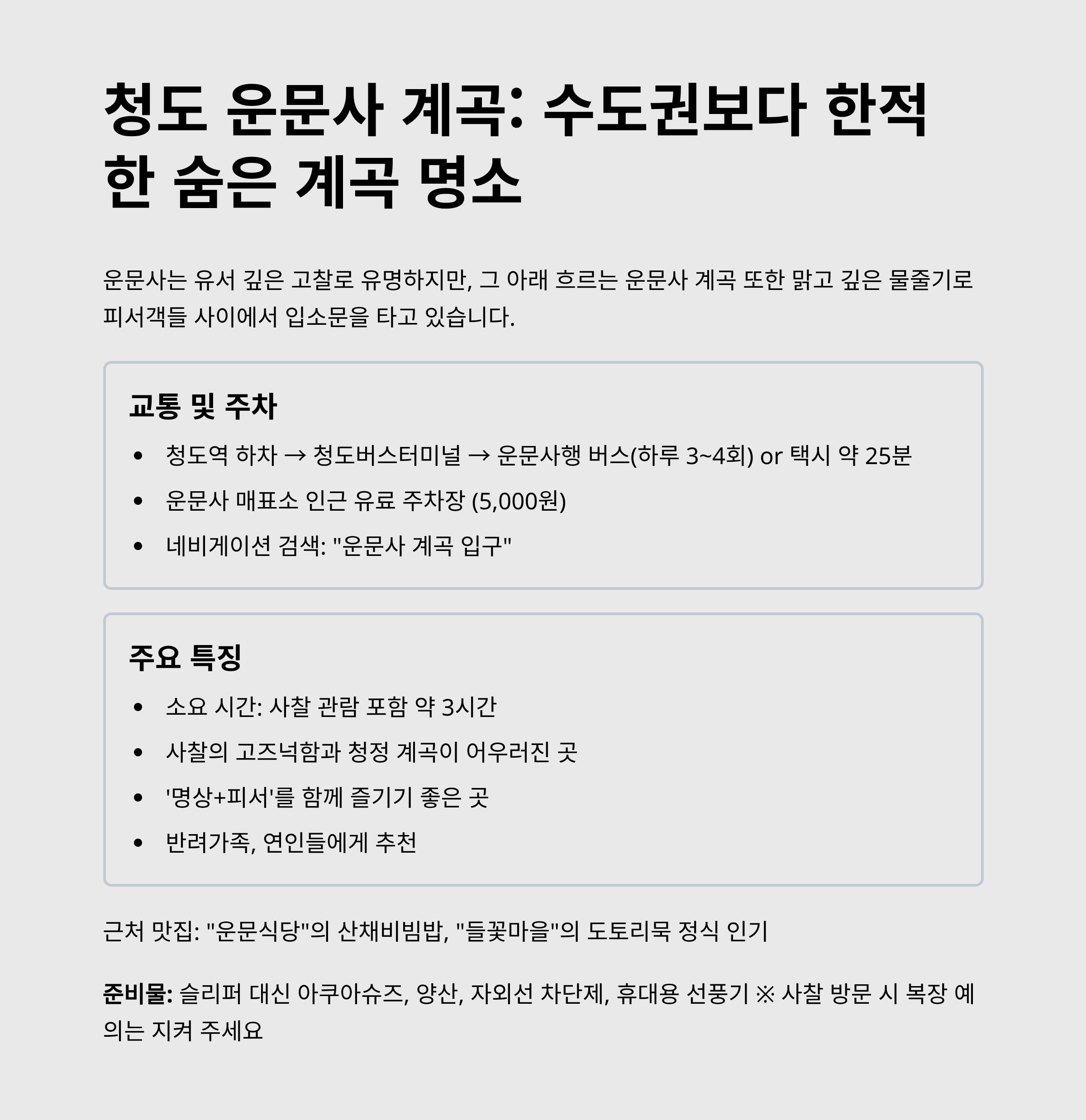 | 청도 운문사 계곡 | 사찰 명상+계곡 휴식 | 연인, 중장년 | 대중교통 가능 |
