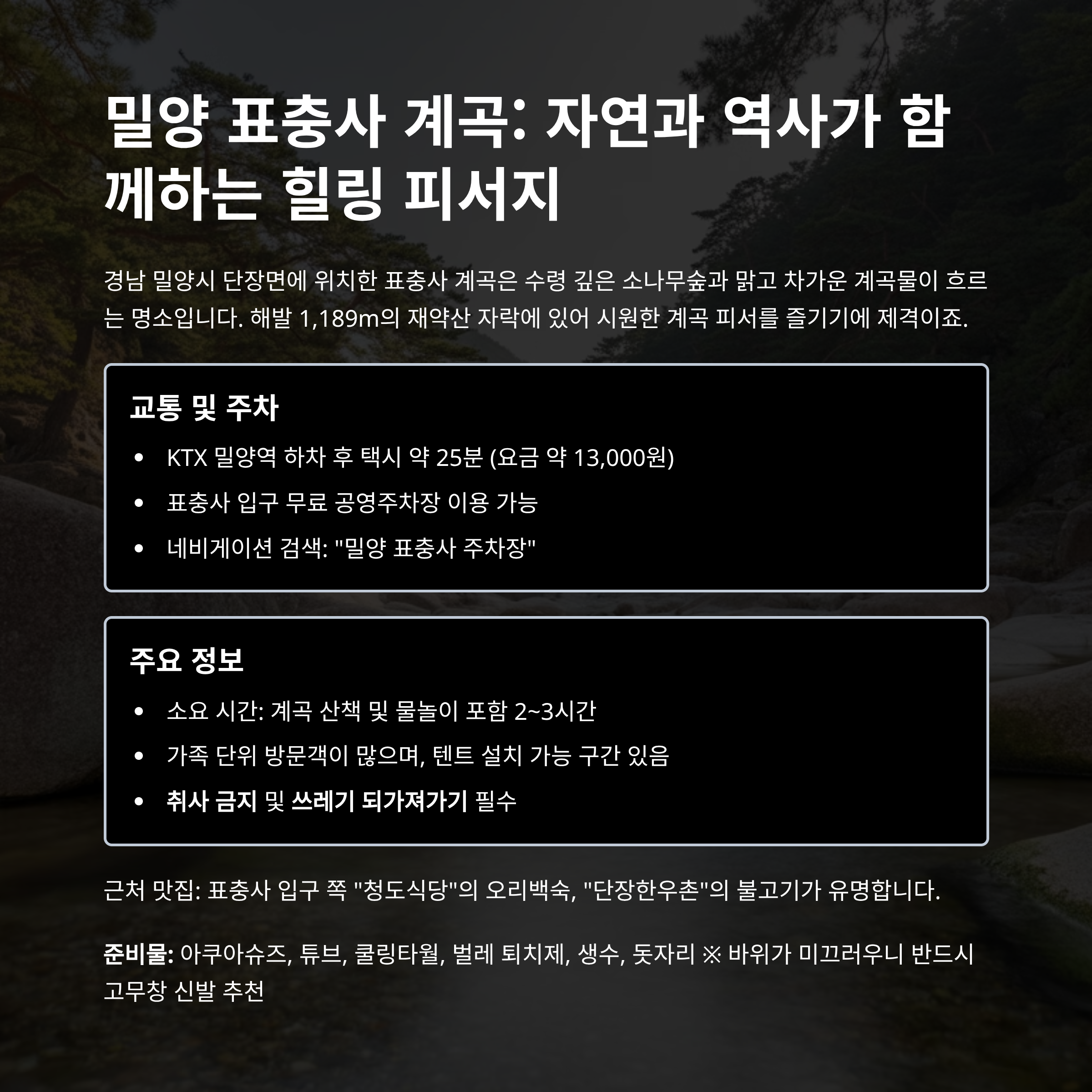 - 교통 팁: KTX 밀양역 하차 후 택시 약 25분 (요금 약 13,000원)
