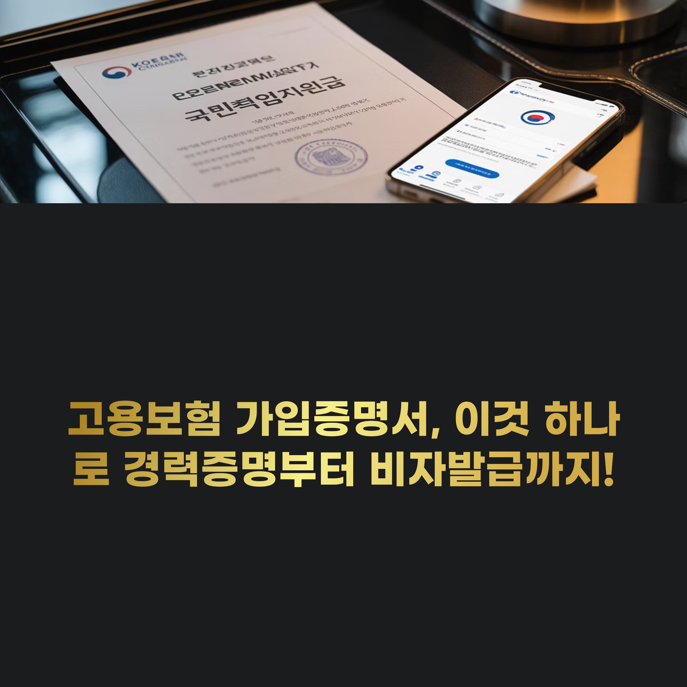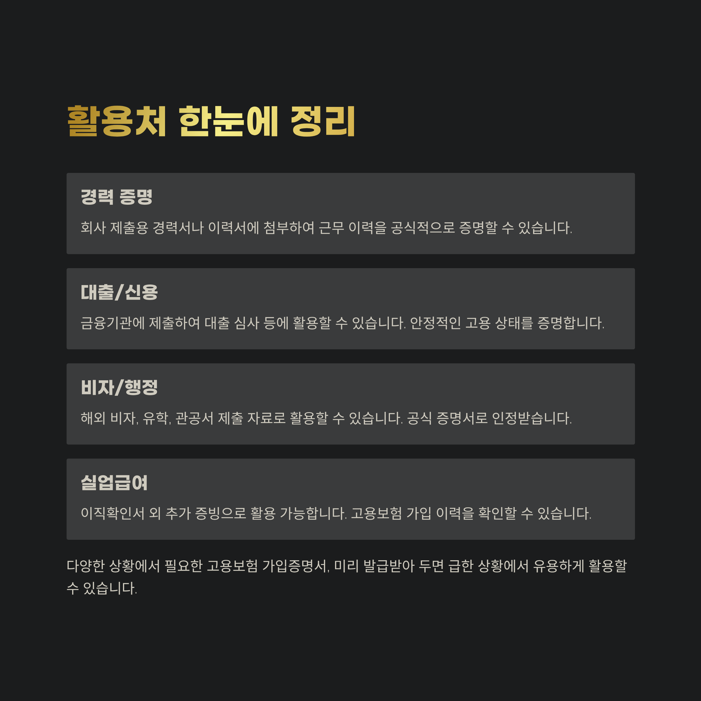 4대 사회보험의 가입내역을 한 눈에 확인할 수 있는 **"4대 보험 가입증명서"**와 별도로, 고용보험만 단독으로 필요한 경우에 쓰입니다.