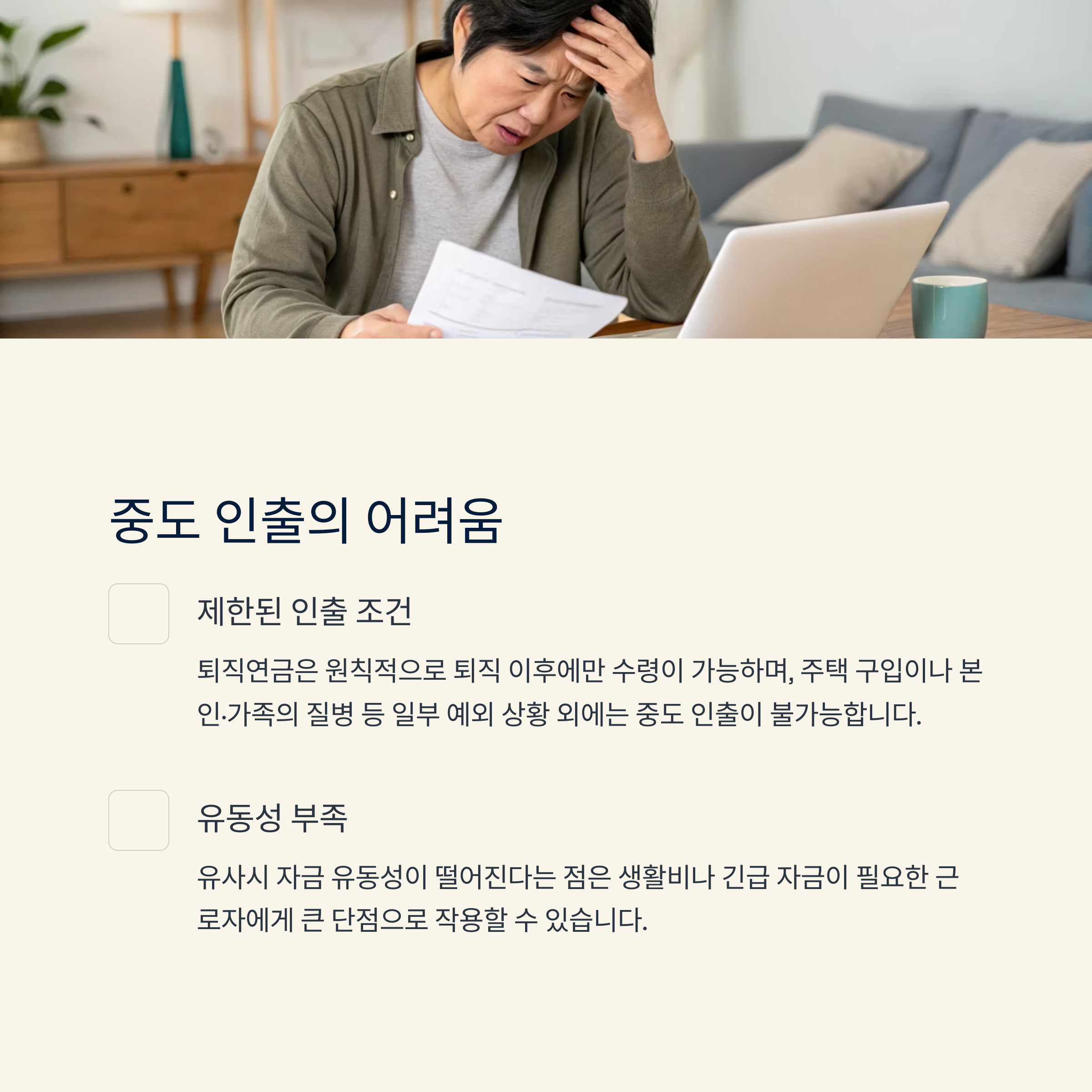 제한적으로 일시금 수령만 허용되어 유연성이 떨어질 수 있습니다.
