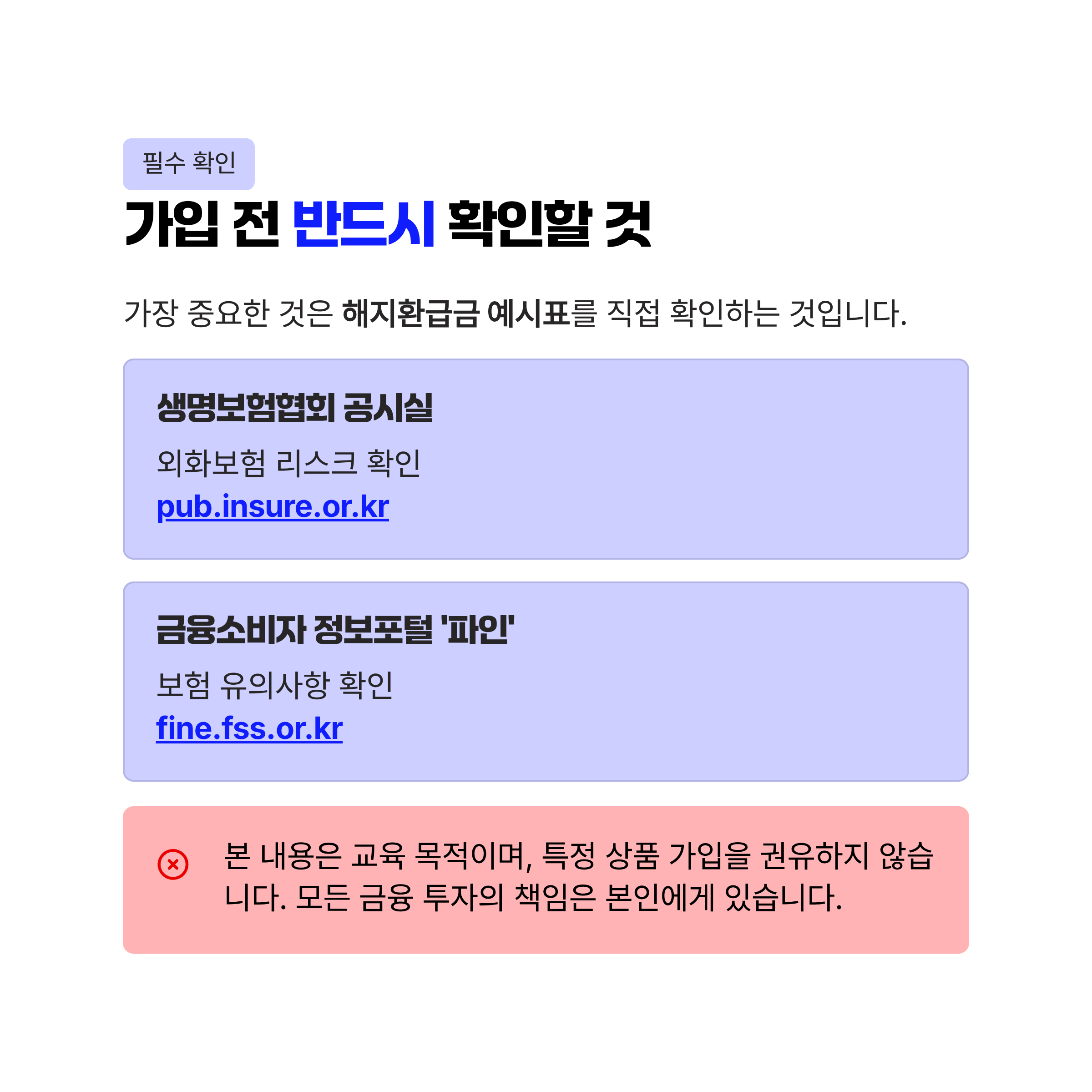 본 포스팅은 교육 및 정보 공유를 목적으로 작성되었습니다. 특정 상품의 가입을 권유하거나 보장하지 않습니다. 모든 금융 투자의 책임은 본인에게 있으며, 달러보험은 환율 변동과 사업비 구조로 인해 원금 손실이 발생할 수 있는 위험 상품입니다. 가입 전 반드시 보험사의 상품설명서와 약관을 꼼꼼히 확인하시기 바랍니다.