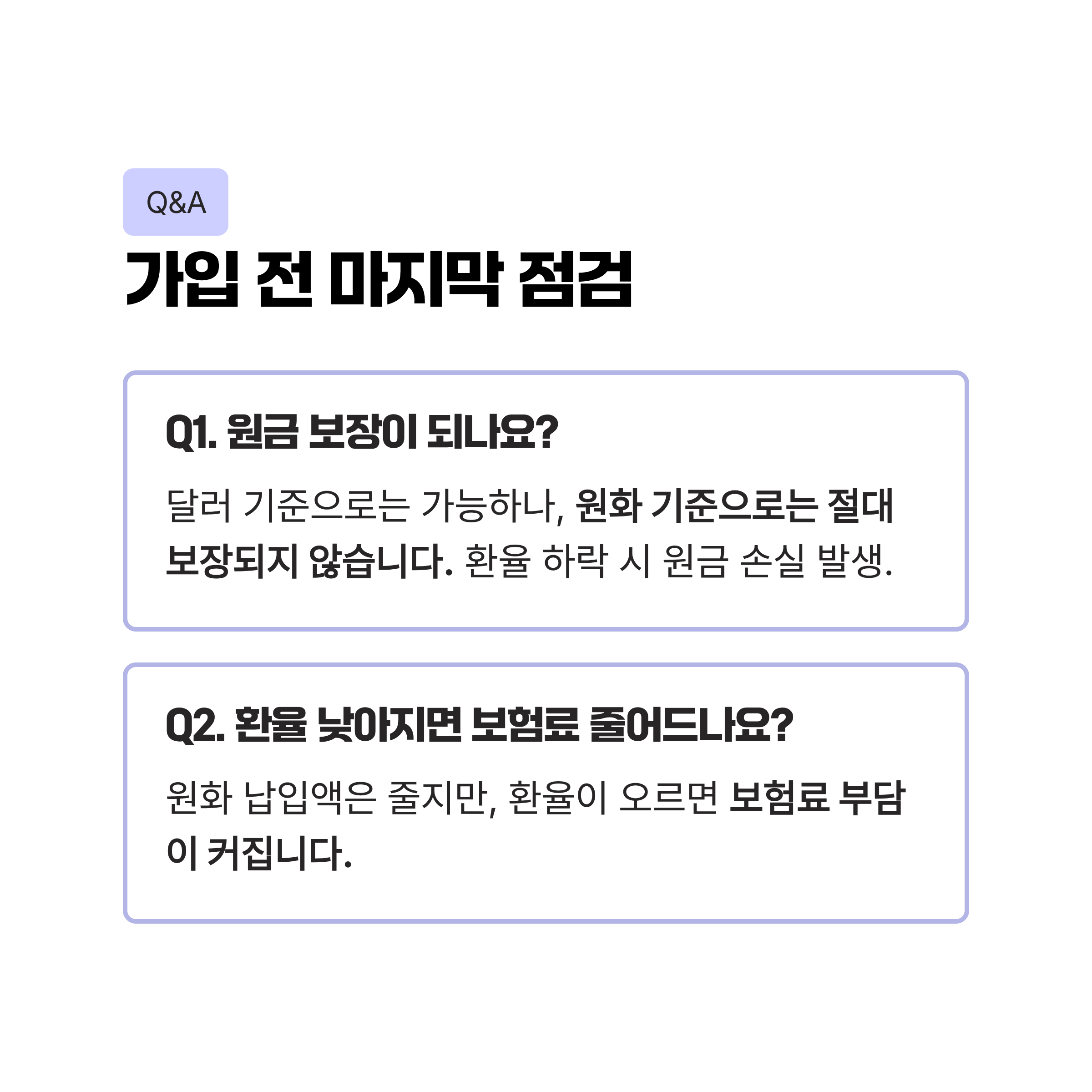 A. 원화로 낼 경우, 환율이 낮아지면 내야 할 원화 금액은 줄어듭니다. 하지만 환율이 오르면 내가 감당해야 할 보험료 부담은 커집니다.