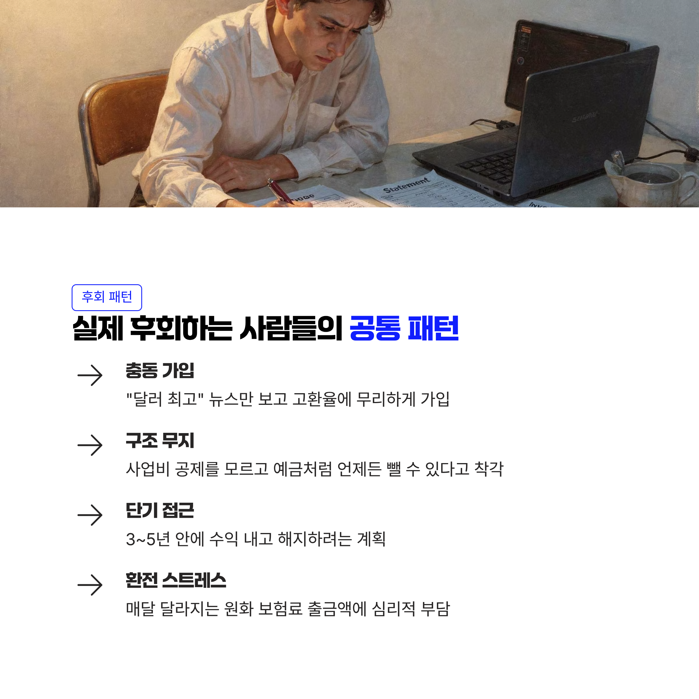 • 해지 환급금의 비극: 가입 후 3년 이내에 해지할 경우, 환율이 올랐음에도 불구하고 원금의 50~70%도 건지지 못하는 경우가 허다합니다.