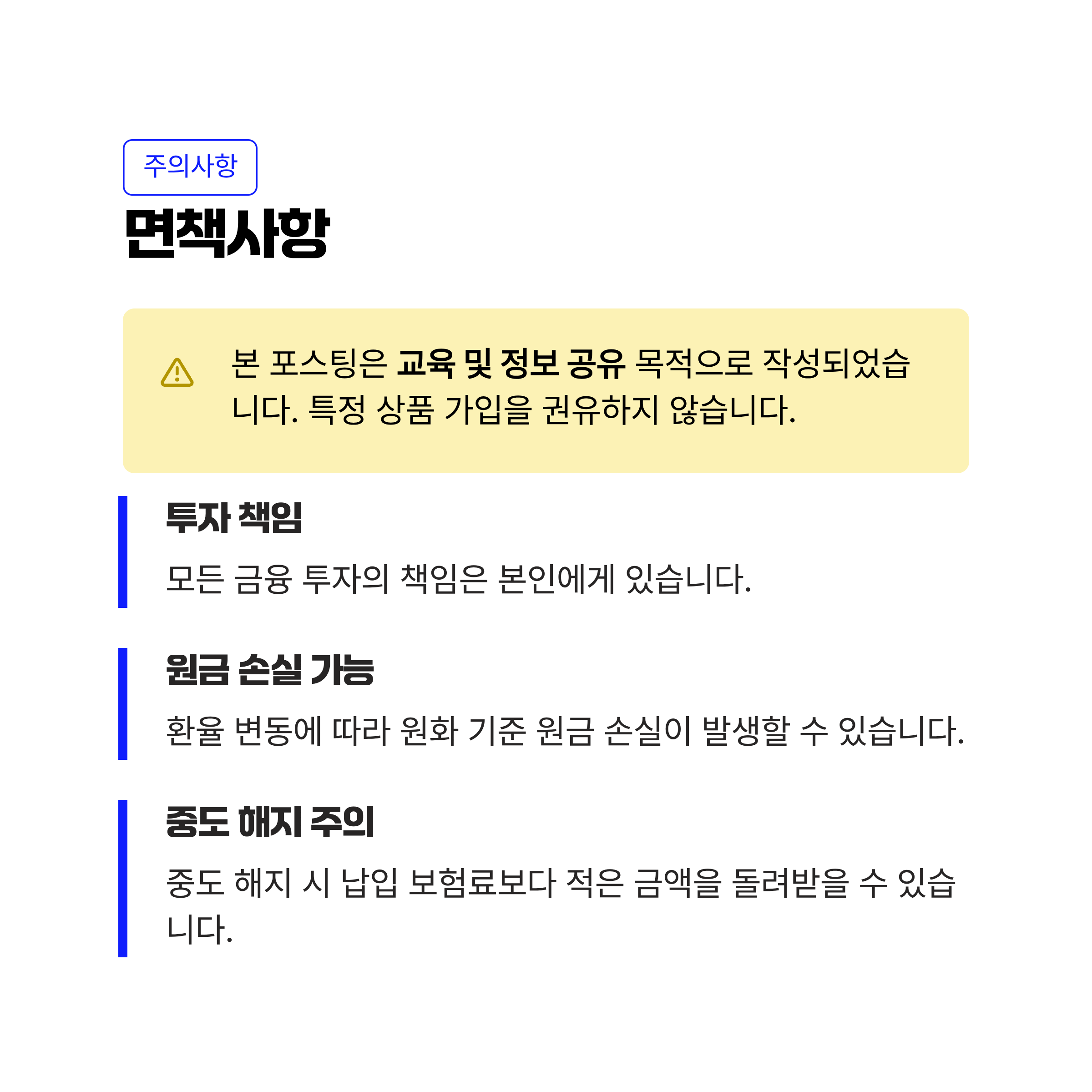 - 단기 수익 상품이 아님: 보험은 초기 사업비가 발생하므로, 환율이 올라도 단기간에 해지하면 무조건 손해입니다.