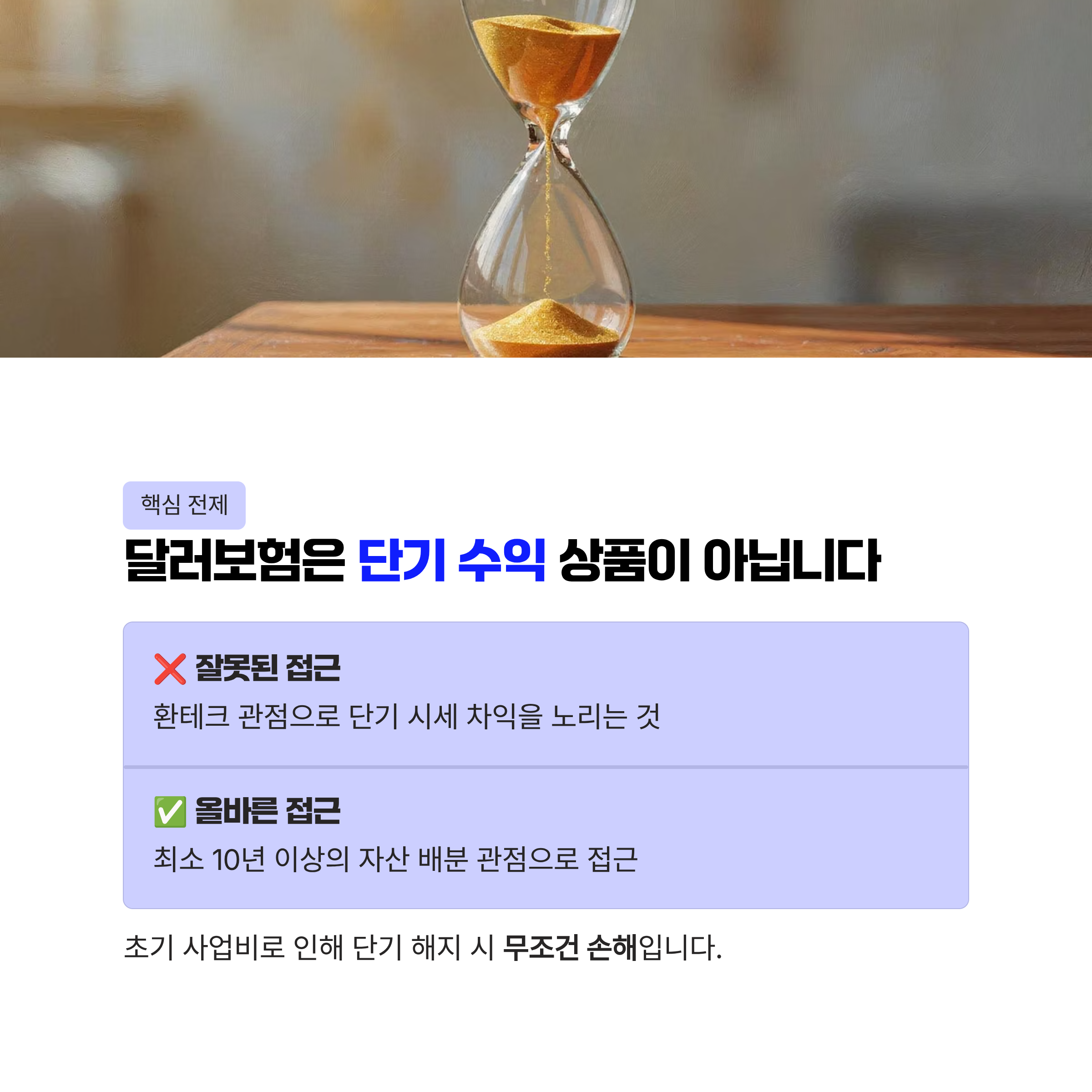 달러보험은 주식이나 달러 예금처럼 단기 시세 차익을 노리는 상품이 아닙니다. 많은 초보자가 저지르는 실수가 '환테크' 관점으로만 접근하는 것입니다.