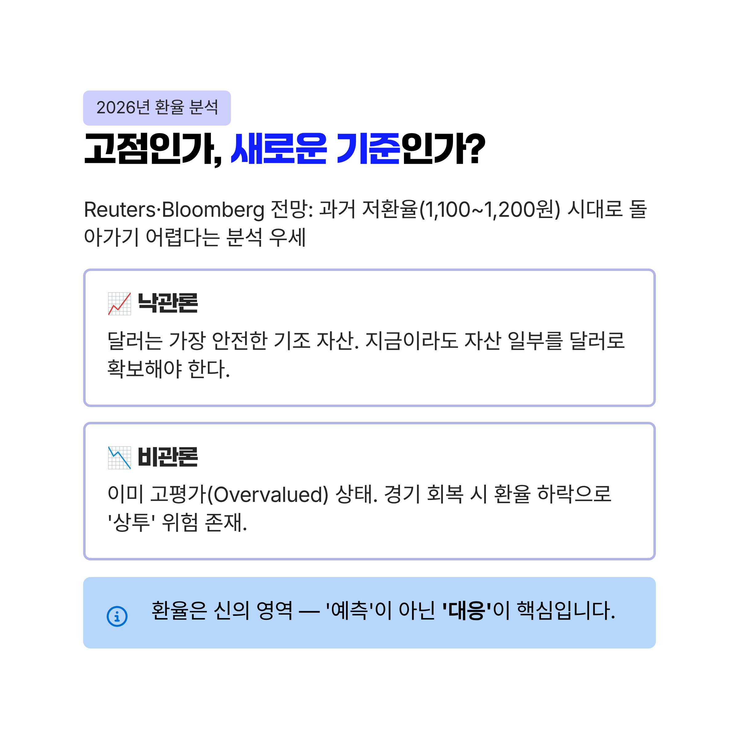 - 비관론: 이미 충분히 고평가된 상태(Overvalued)이므로, 경기 회복 시 환율이 하락하여 '상투'를 잡을 위험이 있다고 경고합니다.