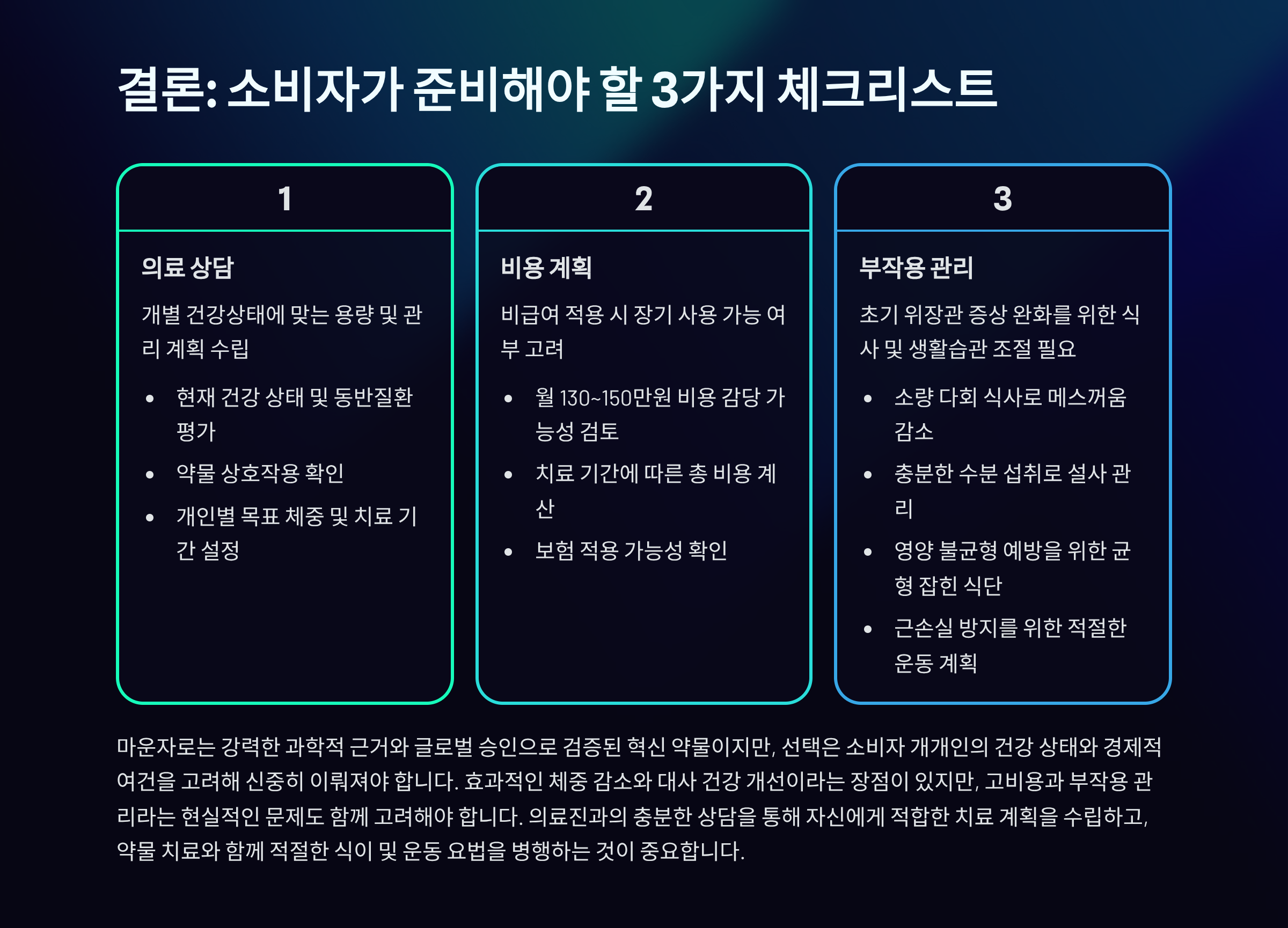 마운자로는 강력한 과학적 근거와 글로벌 승인으로 검증된 혁신 약물이지만, 선택은 소비자 개개인의 건강 상태와 경제적 여건을 고려해 신중히 이뤄져야 합니다.