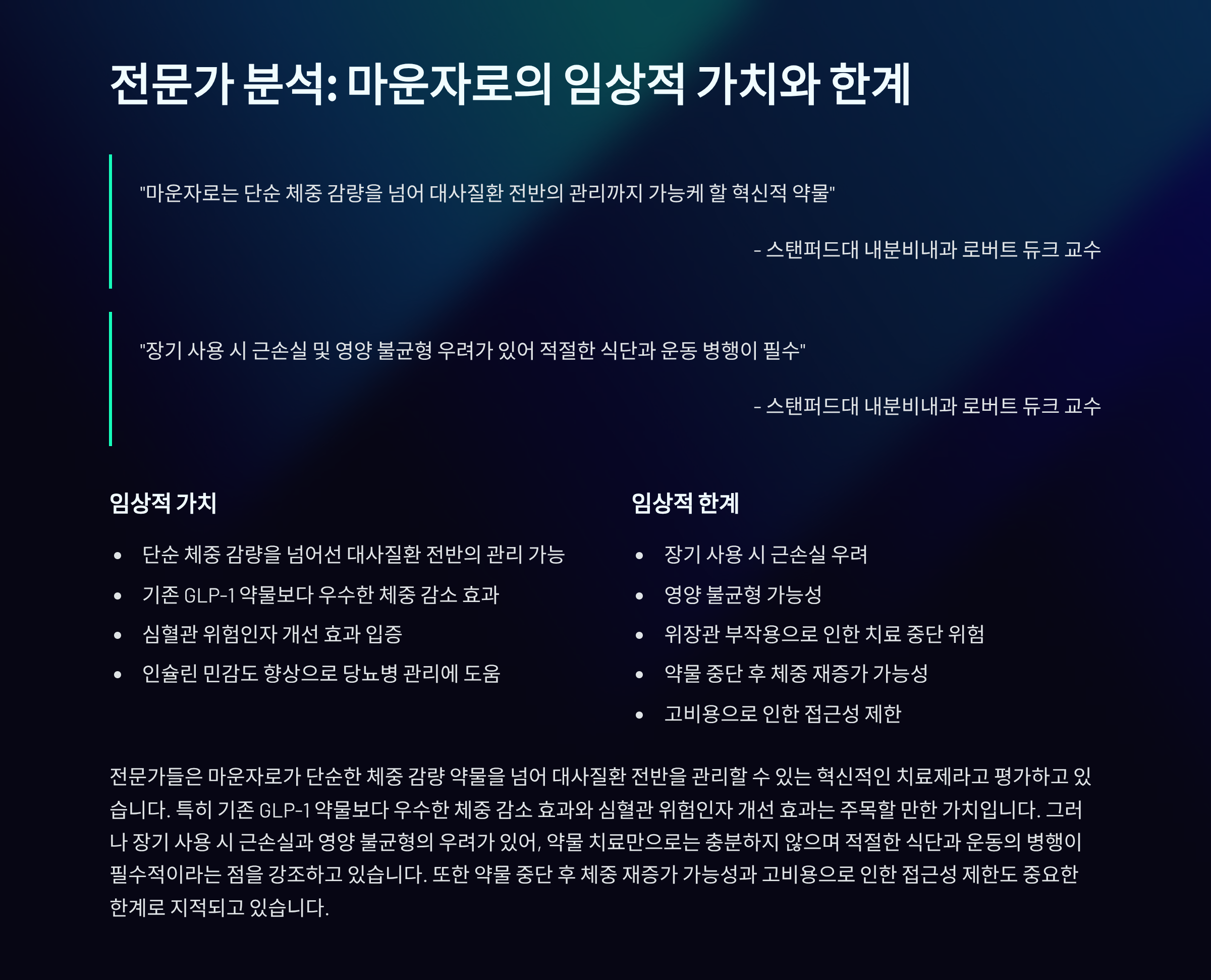 스탠퍼드대 내분비내과 로버트 듀크 교수는 “마운자로는 단순 체중 감량을 넘어 대사질환 전반의 관리까지 가능케 할 혁신적 약물”이라고 평가했습니다. 하지만 “장기 사용 시 근손실 및 영양 불균형 우려가 있어 적절한 식단과 운동 병행이 필수”라고 덧붙였습니다.