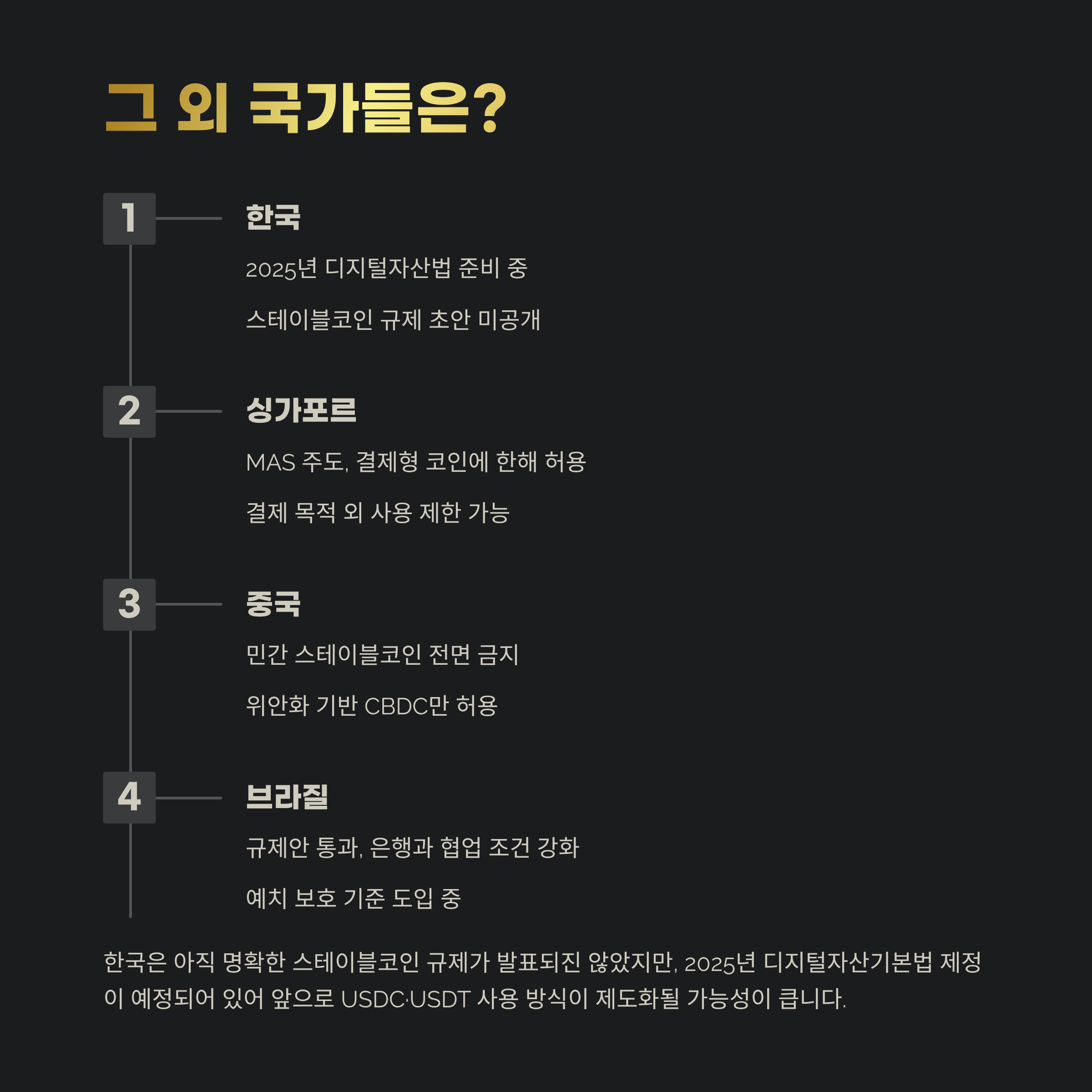 | 한국 | 2025년 디지털자산법 준비 중 | 스테이블코인 규제 초안 미공개 |