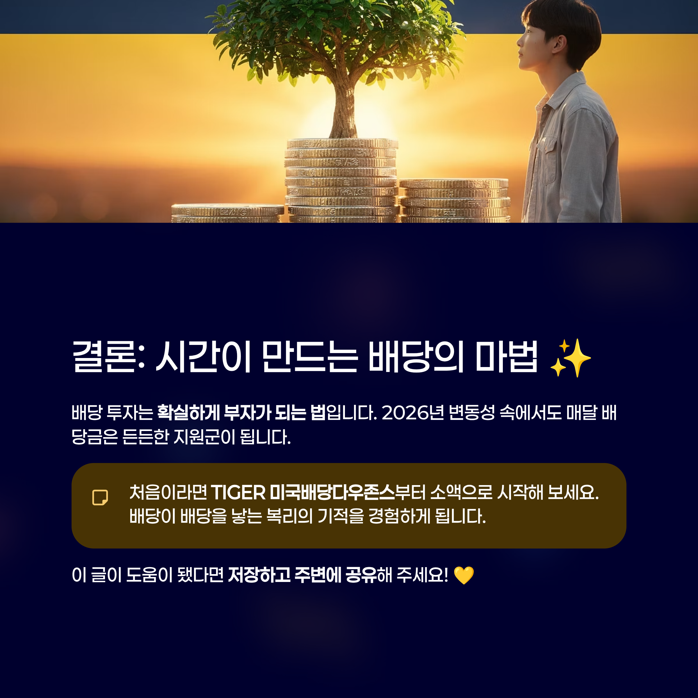 처음이라면 주저하지 말고 TIGER 미국배당다우존스 같은 우량한 종목부터 소액으로 시작해 보세요. 배당금이 다시 배당을 낳는 복리의 기적을 경험하시게 될 것입니다.