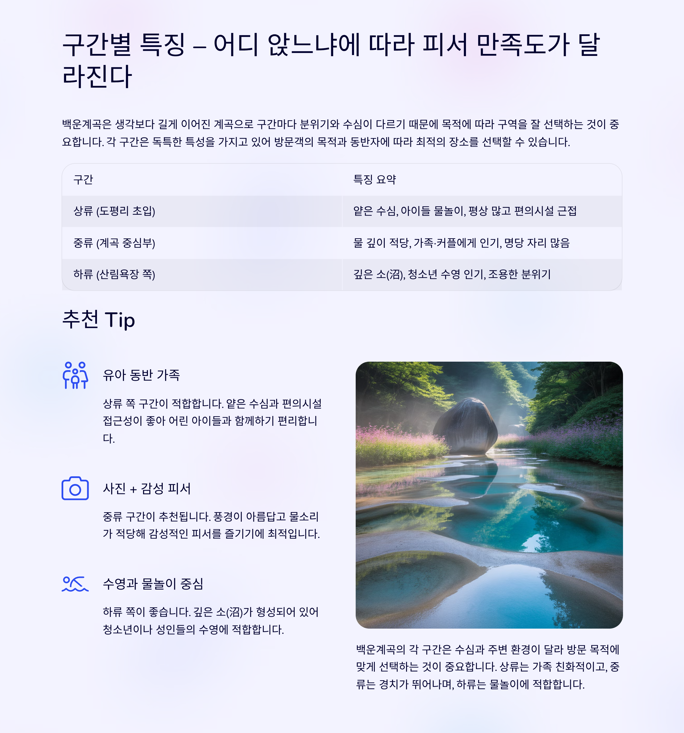 | 중류 (계곡 중심부) | 물 깊이 적당, 가족·커플에게 인기, 명당 자리 많음 |