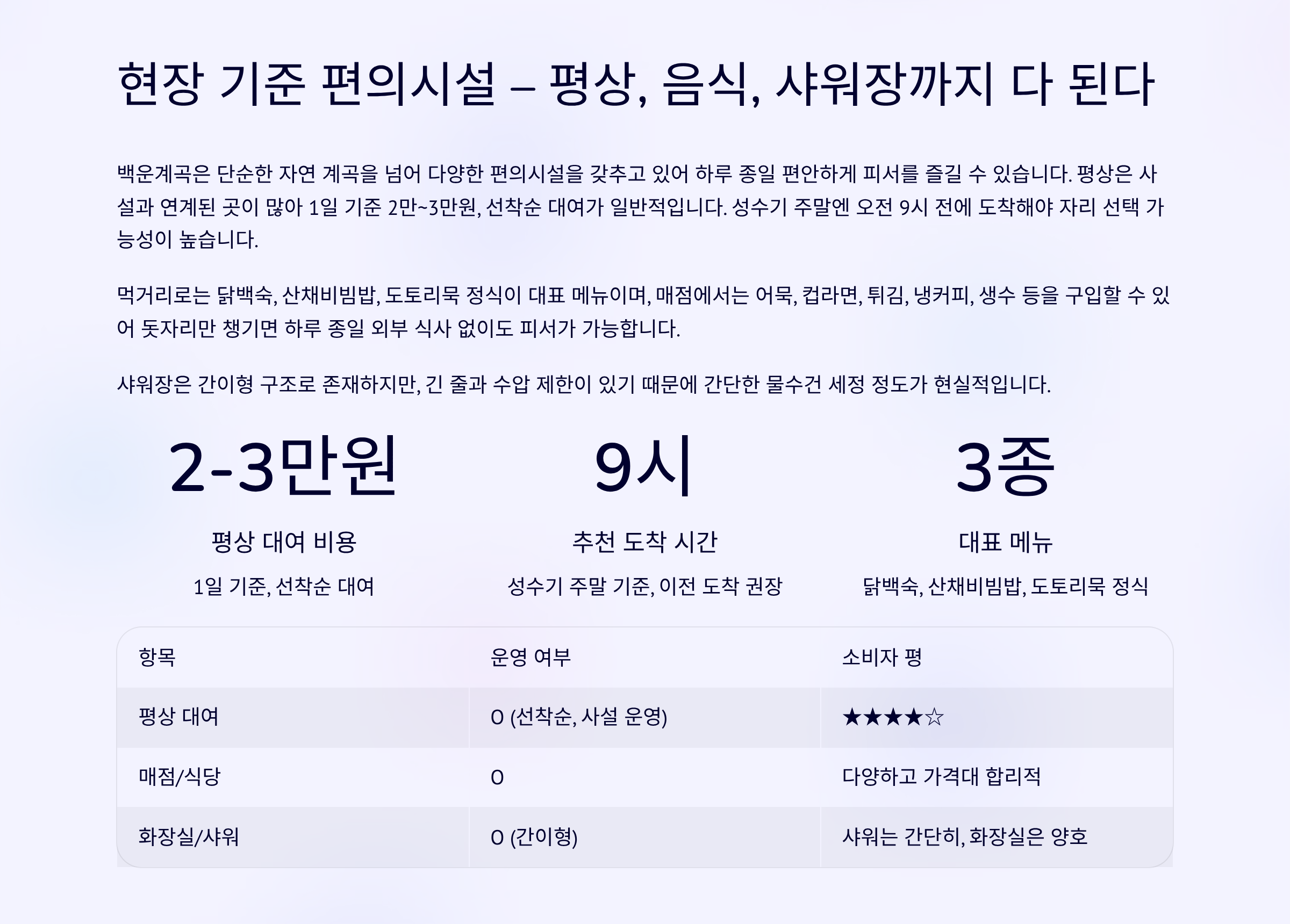 - 시설 완비: 평상 대여, 매점, 족욕장, 화장실, 간이 샤워장까지 구비