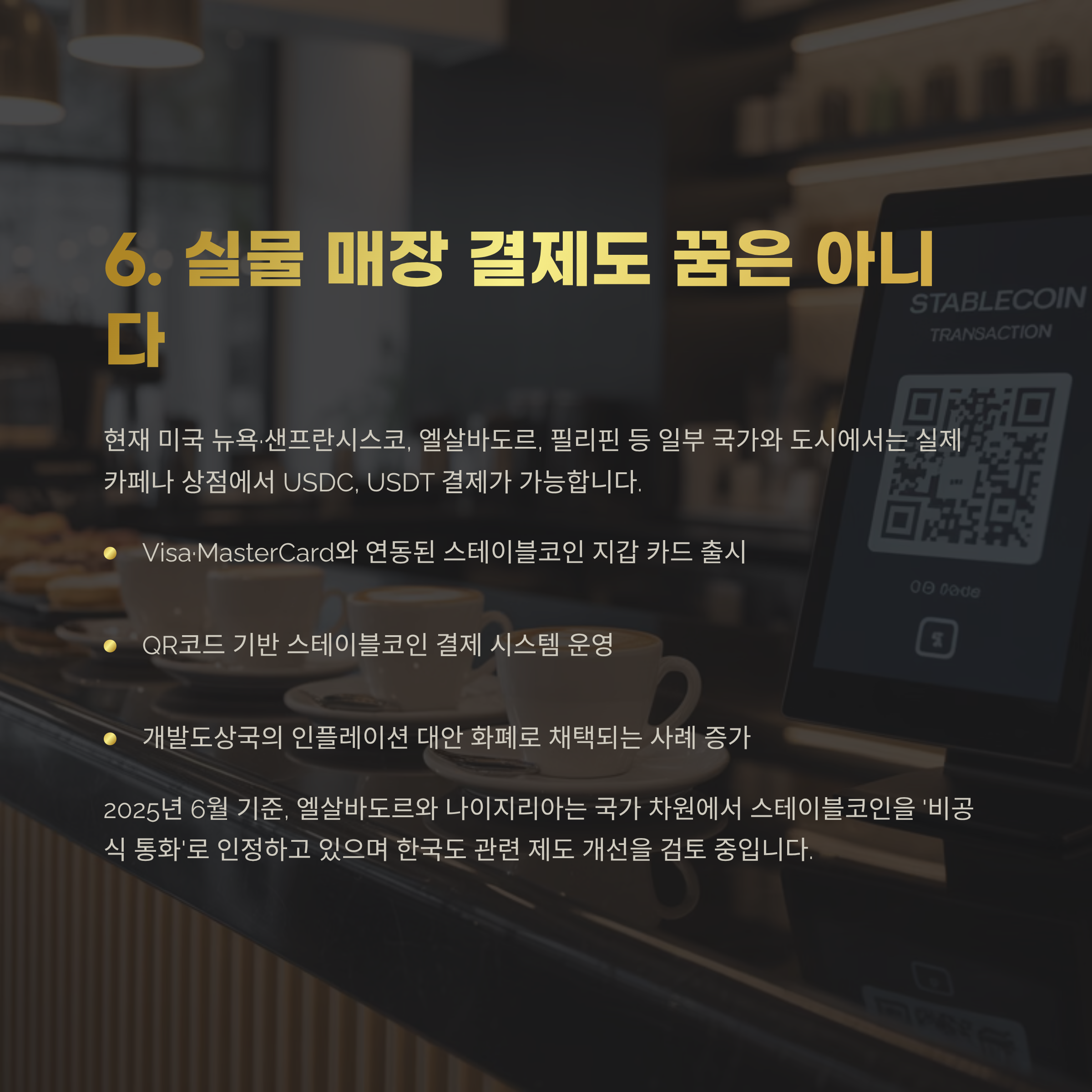 실제 카페나 상점에서 USDC, USDT 결제가 가능합니다.
