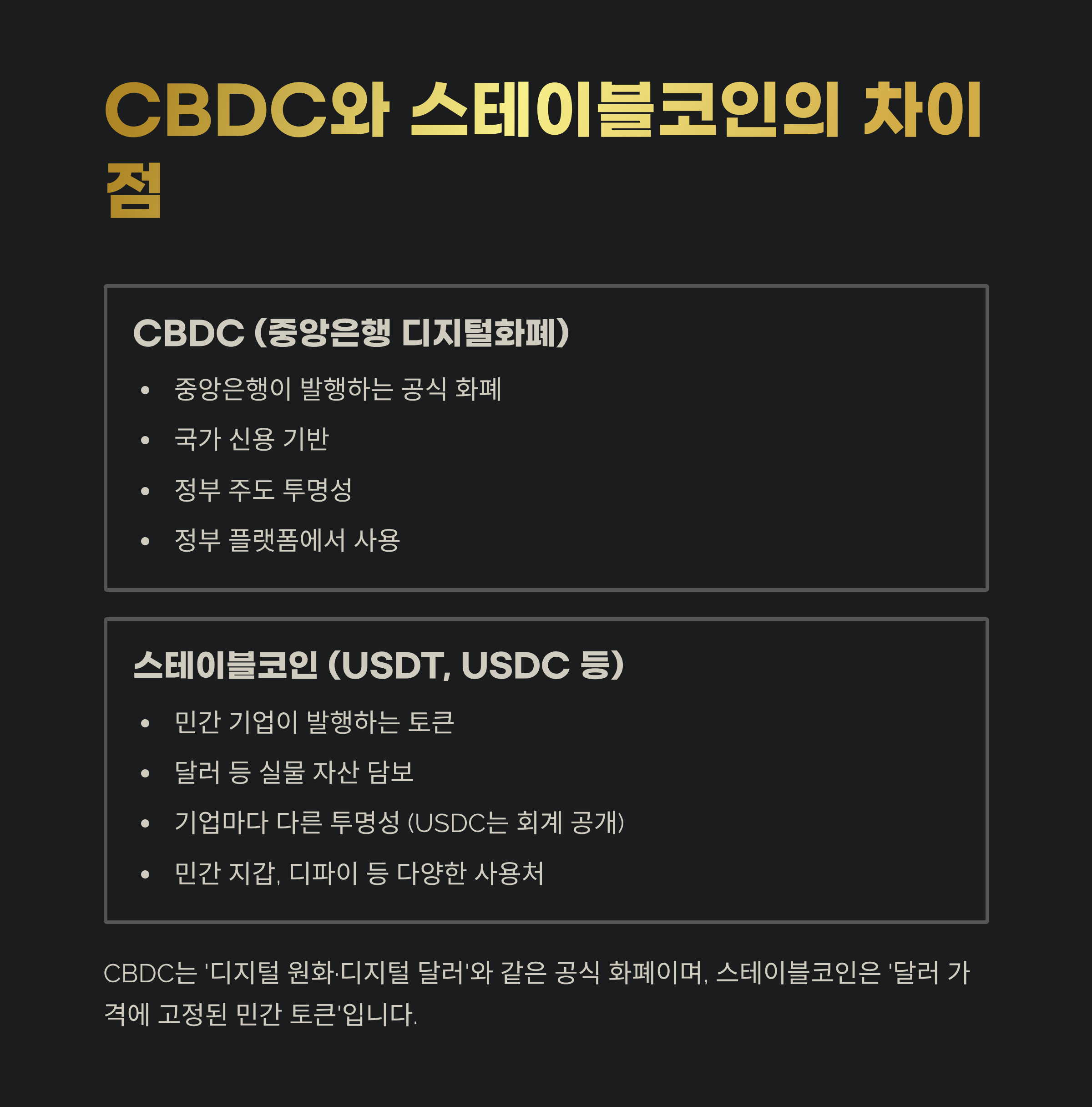 항목 CBDC (중앙은행 디지털화폐) 스테이블코인 (USDT·USDC 등)
