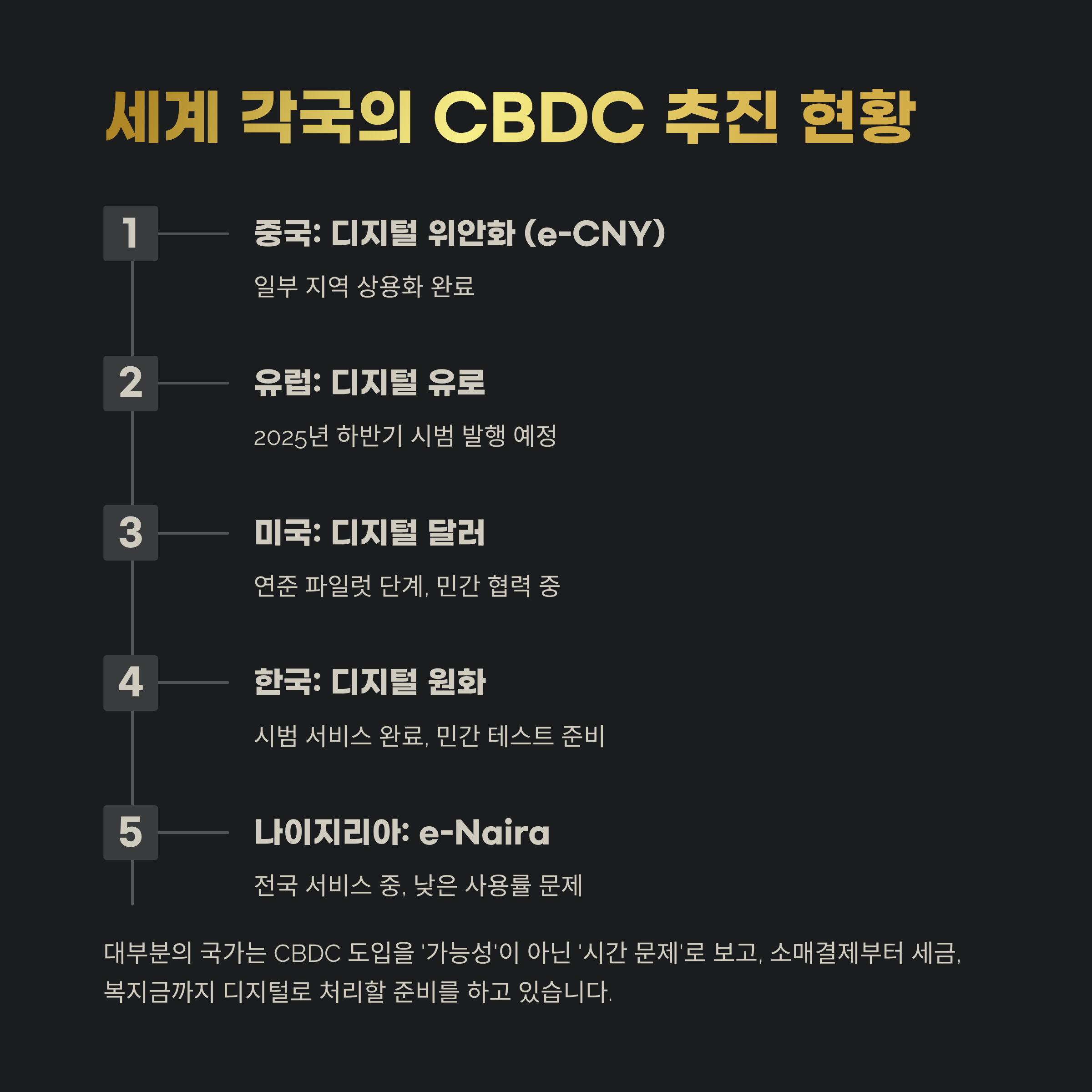 다른 하나는 각국 정부가 준비 중인 CBDC(중앙은행 디지털화폐)**입니다.