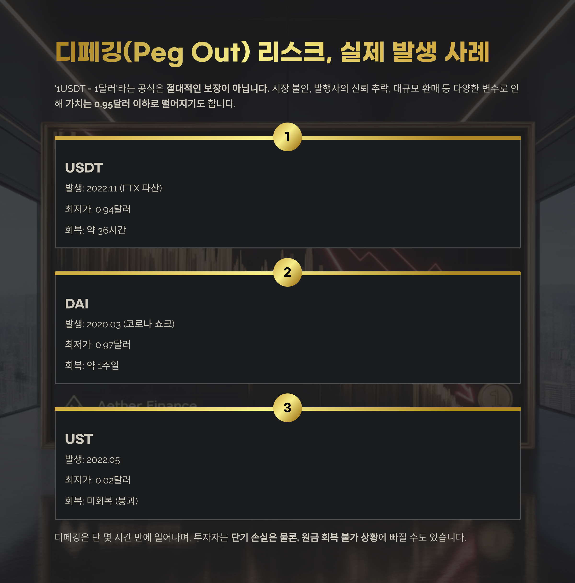 | USDT | 2022.11 (FTX 파산) | 0.94달러 | 약 36시간 |