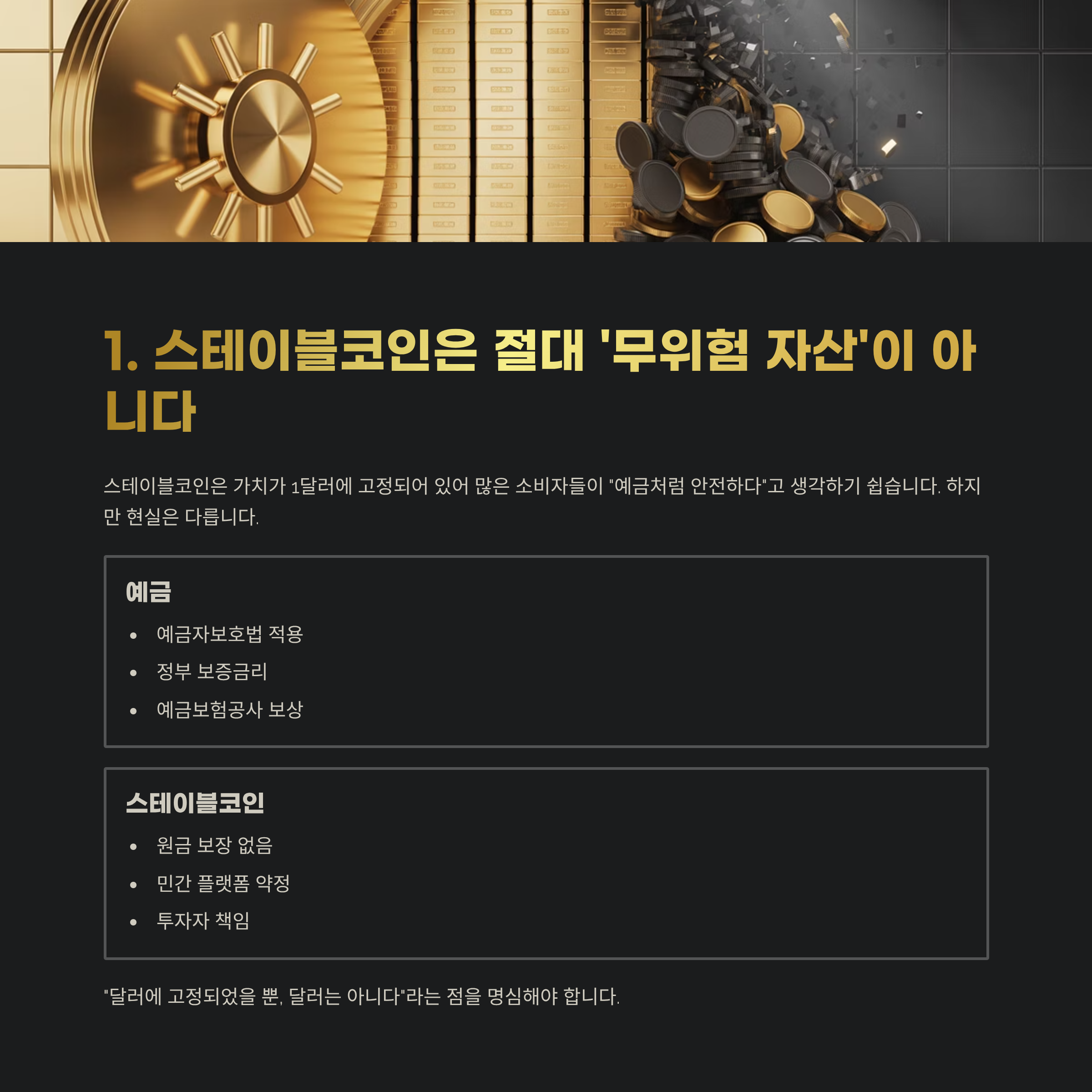 즉, 스테이블코인은 원금 보장도 없고, 예치 플랫폼 파산 시 전액 손실 가능성도 존재합니다.