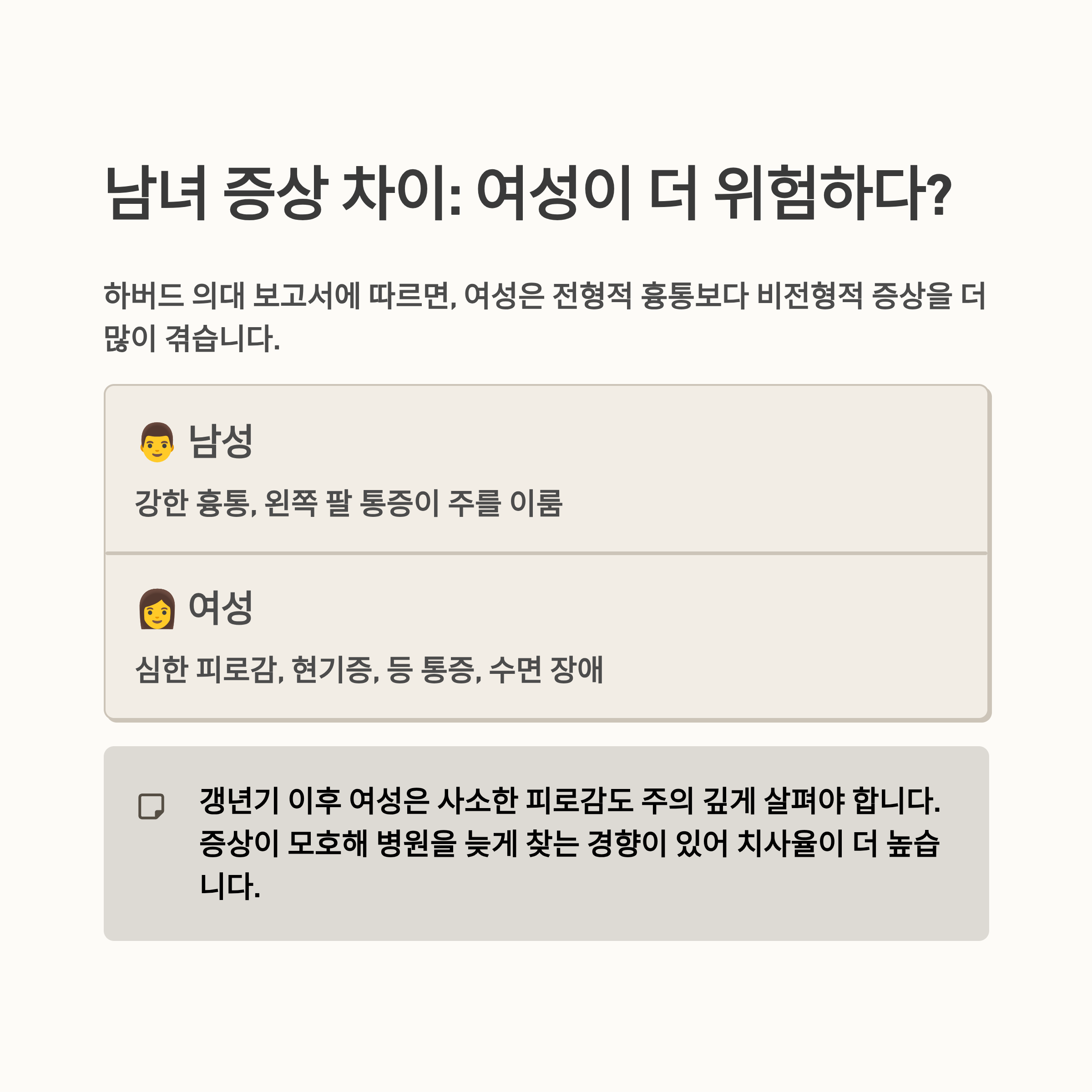 - 위험성: 여성은 증상이 모호해 병원을 늦게 찾는 경향이 있어 치사율이 더 높게 나타납니다. 갱년기 이후 여성이라면 사소한 피로감도 주의 깊게 살펴야 합니다.