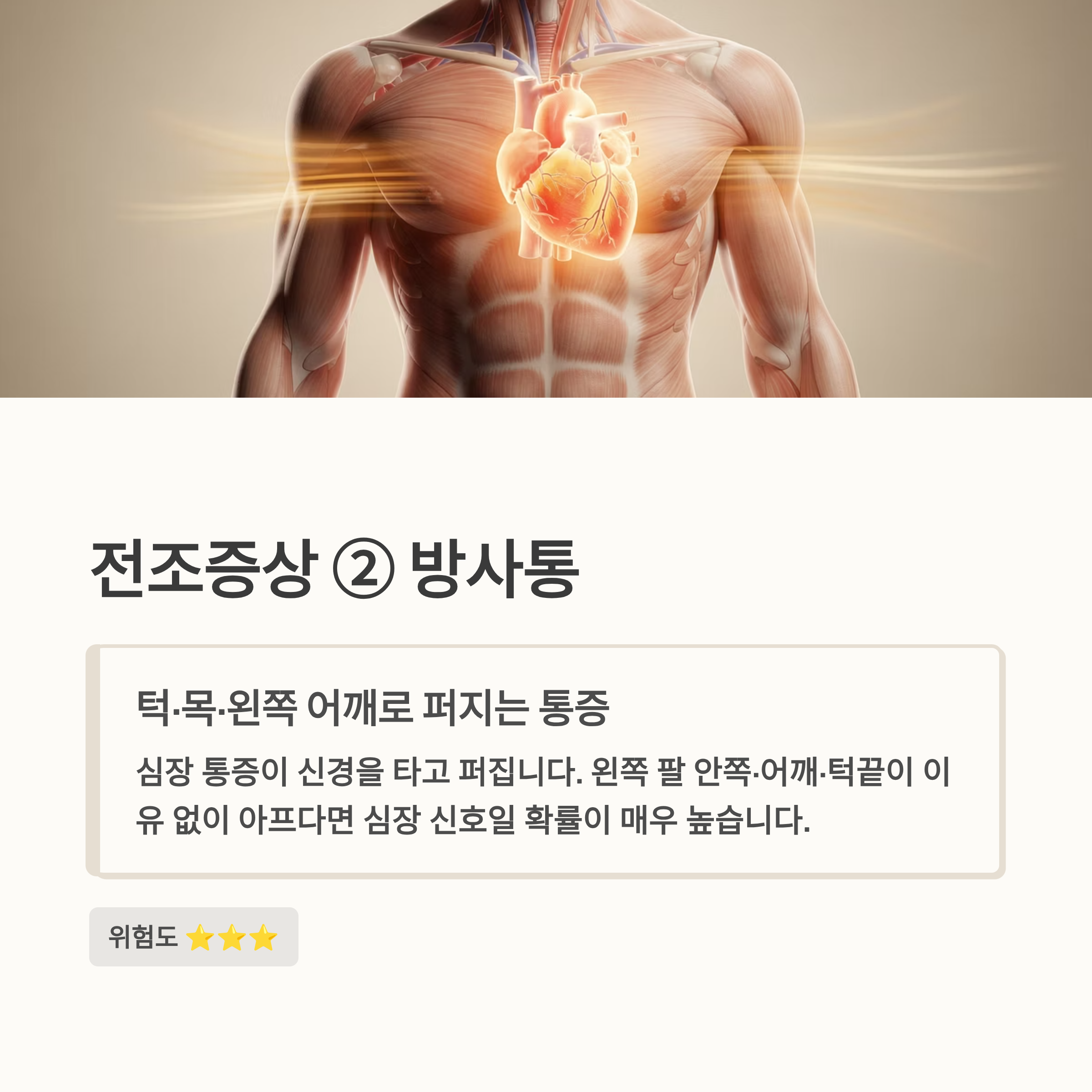 | 방사통 | 목, 턱, 왼쪽 팔, 등으로 뻗치는 통증 | ⭐⭐⭐ |