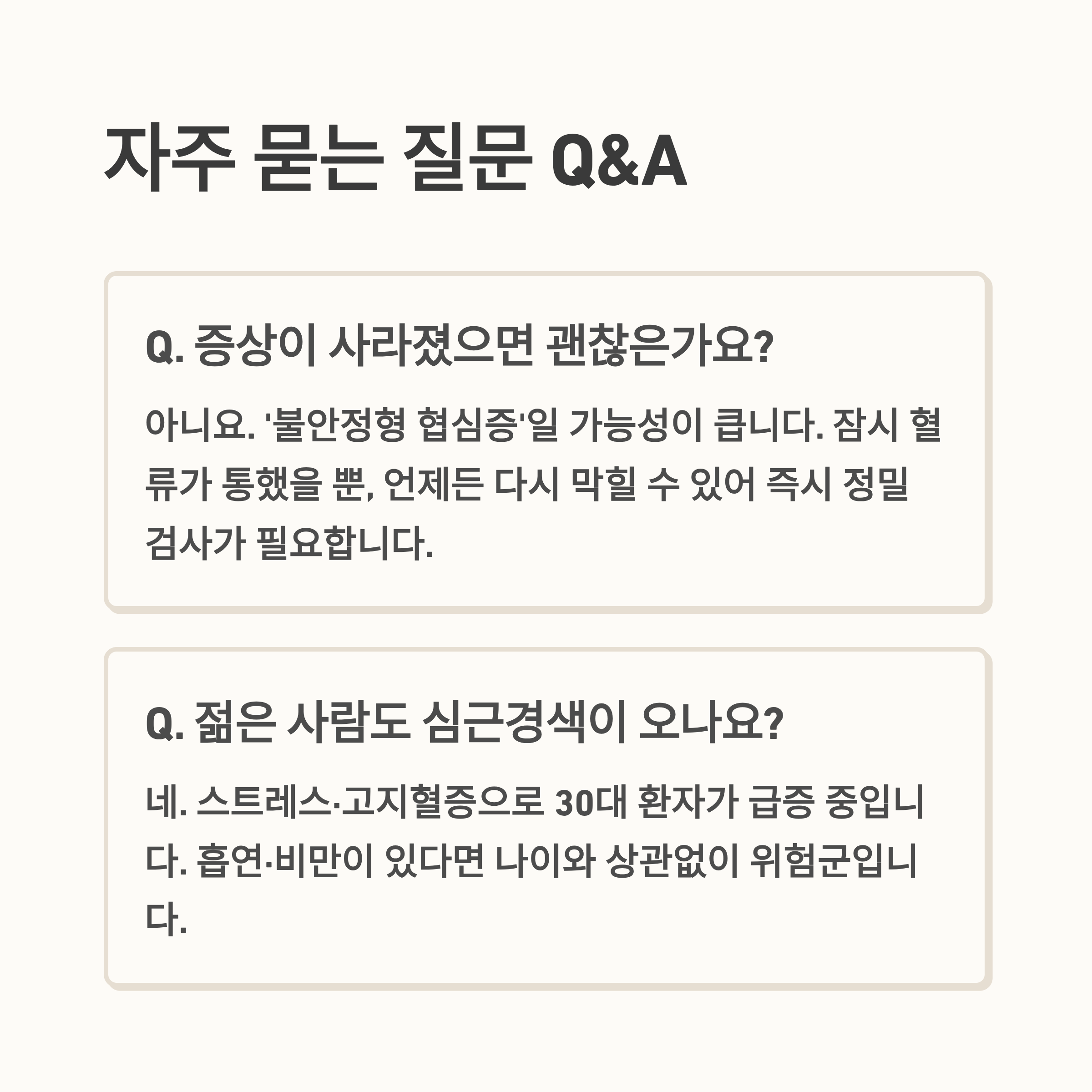 A1. 아니요. '불안정형 협심증'일 가능성이 큽니다. 잠시 혈류가 통했을 뿐, 언제든 다시 막힐 수 있으므로 즉시 정밀 검사를 받아야 합니다.