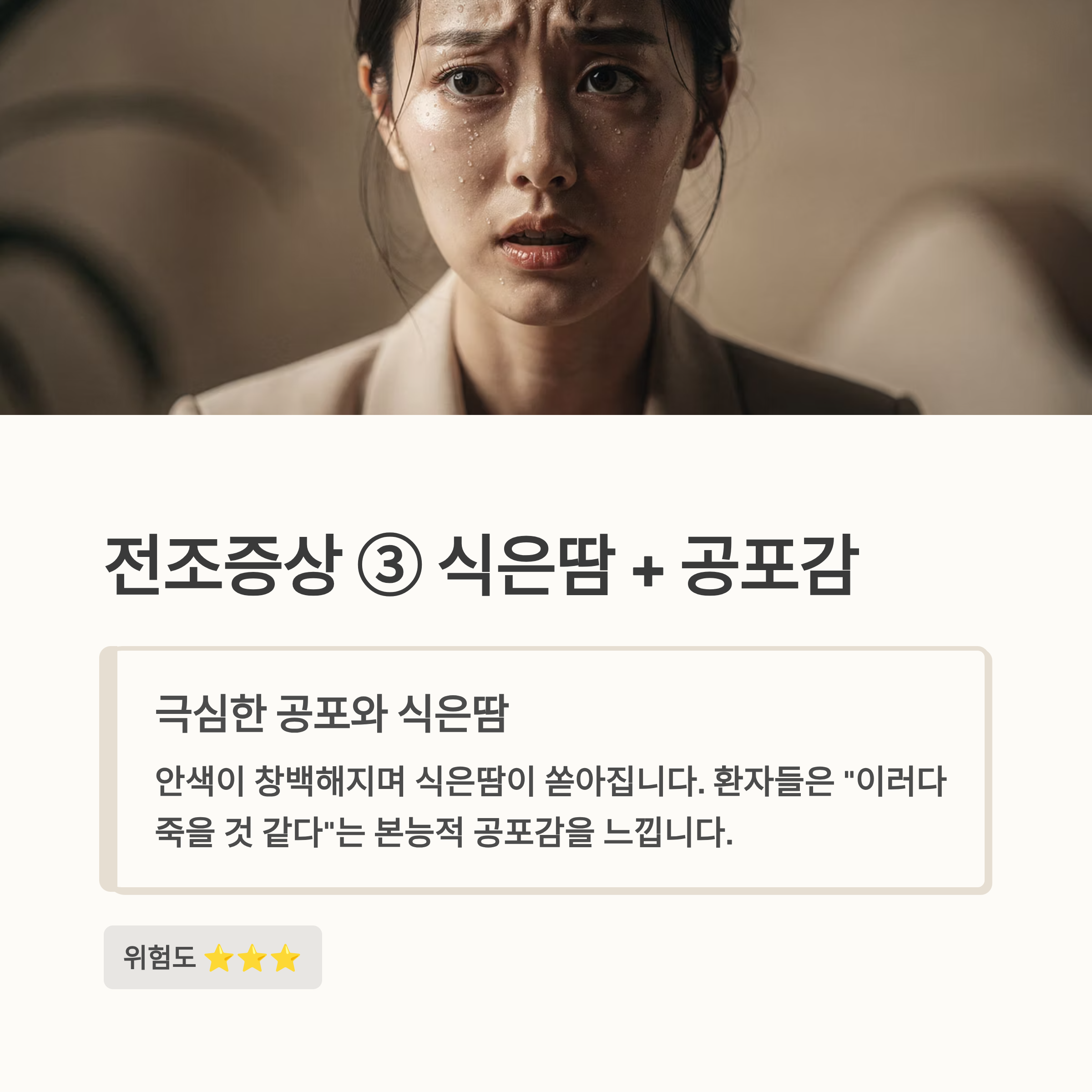 통증과 함께 안색이 창백해지며 식은땀이 비 오듯 쏟아집니다. 환자들은 "이러다 죽을 것 같다"는 본능적인 공포감을 느낍니다.