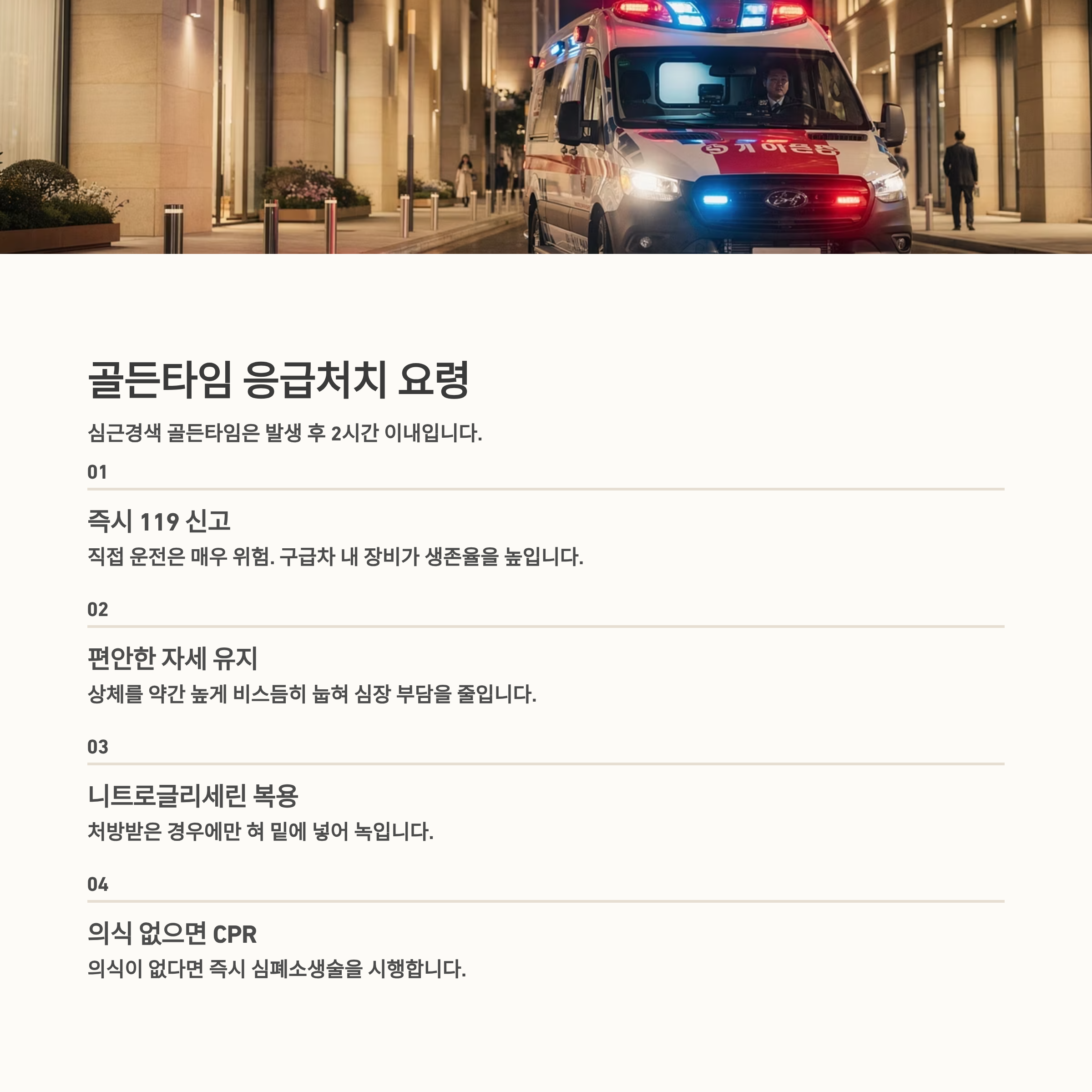 심근경색의 골든타임은 **'발생 후 2시간 이내'**입니다. 이 시간 안에 막힌 혈관을 뚫어야 심장 손상을 최소화할 수 있습니다.