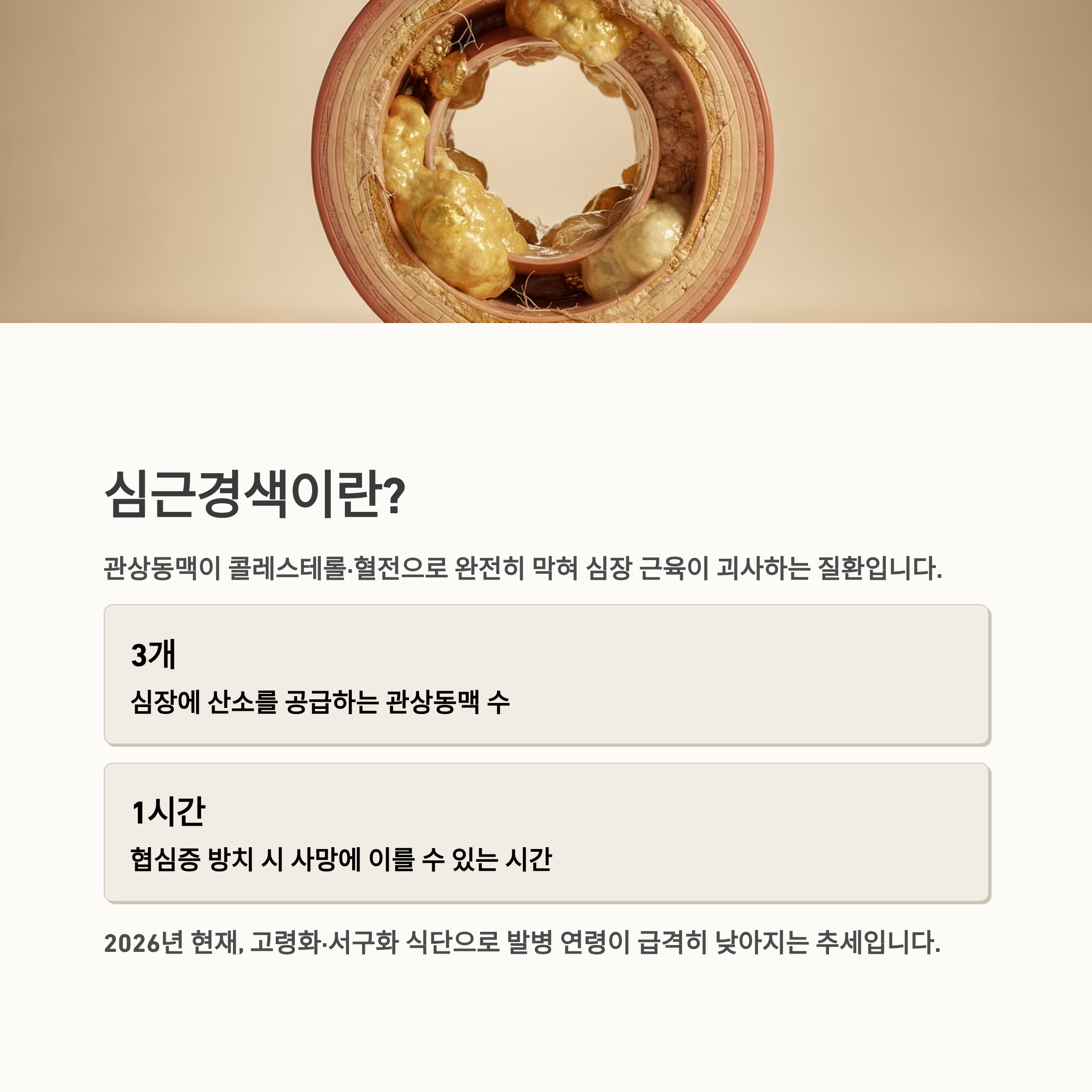 2026년 현재, 고령화와 서구화된 식단으로 인해 발병 연령대가 급격히 낮아지고 있습니다. 특히 협심증 단계에서 적절한 조치를 취하지 않으면 1시간 이내에 사망에 이를 수 있는 무서운 질환입니다.