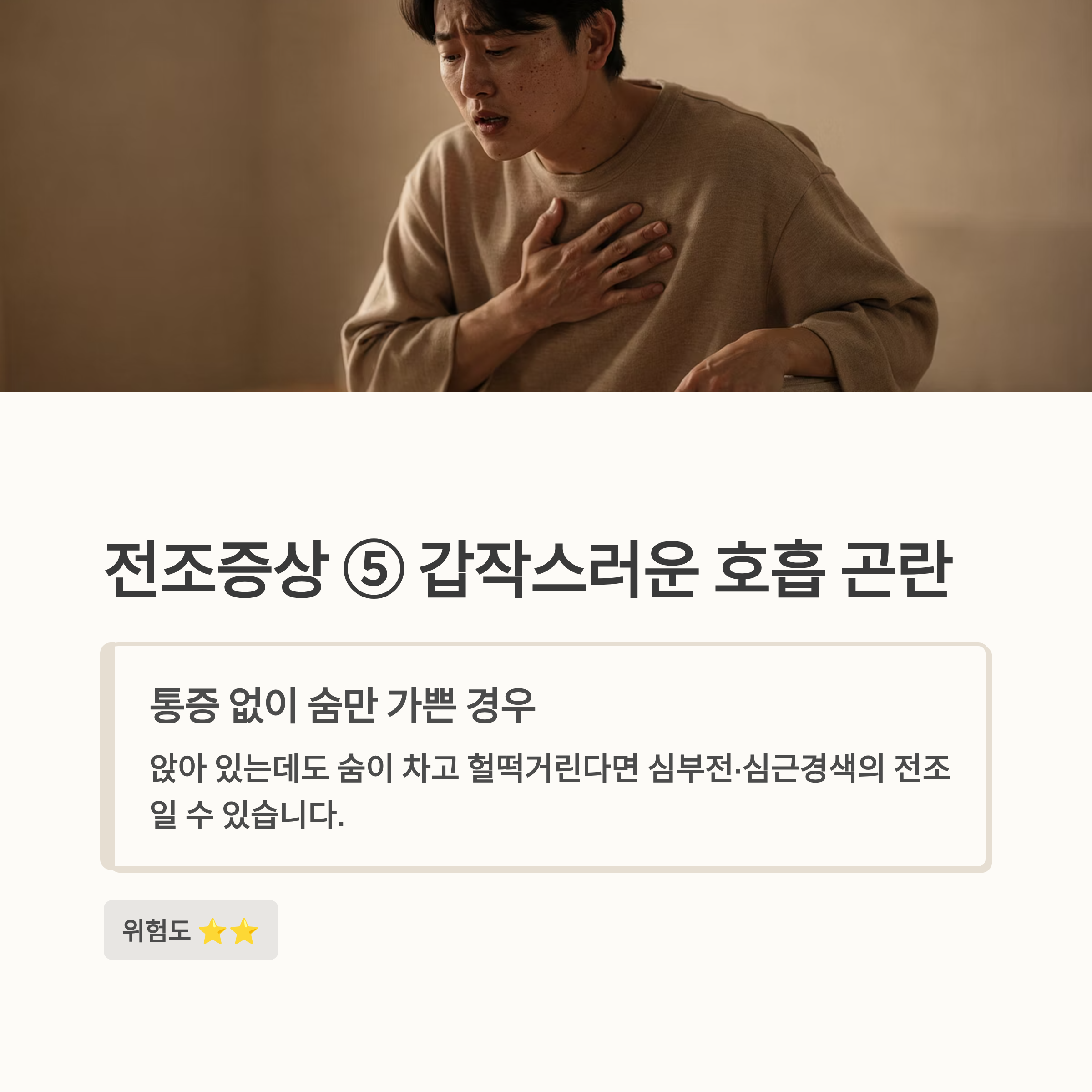 통증 없이 숨만 가쁜 경우도 있습니다. 앉아 있는데도 숨이 차고 헐떡거리게 된다면 심부전이나 심근경색의 전조일 수 있습니다.