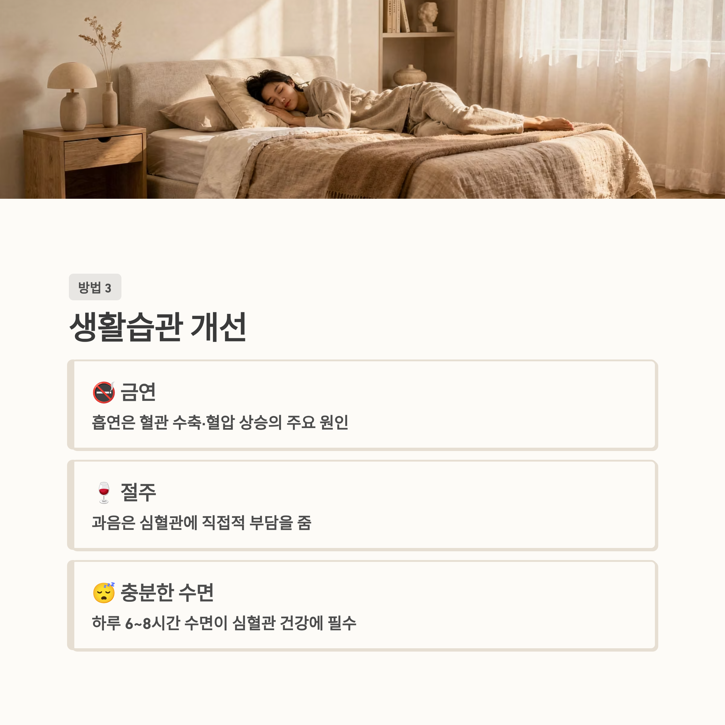 또한 금연과 절주 역시 필수적인 요소입니다. 흡연은 혈관을 수축시키고 혈압을 상승시키는 주요 원인으로 알려져 있습니다. 수면 역시 중요한데, 하루 6~8시간의 충분한 수면을 유지하는 것이 심혈관 건강에 긍정적인 영향을 미칩니다.