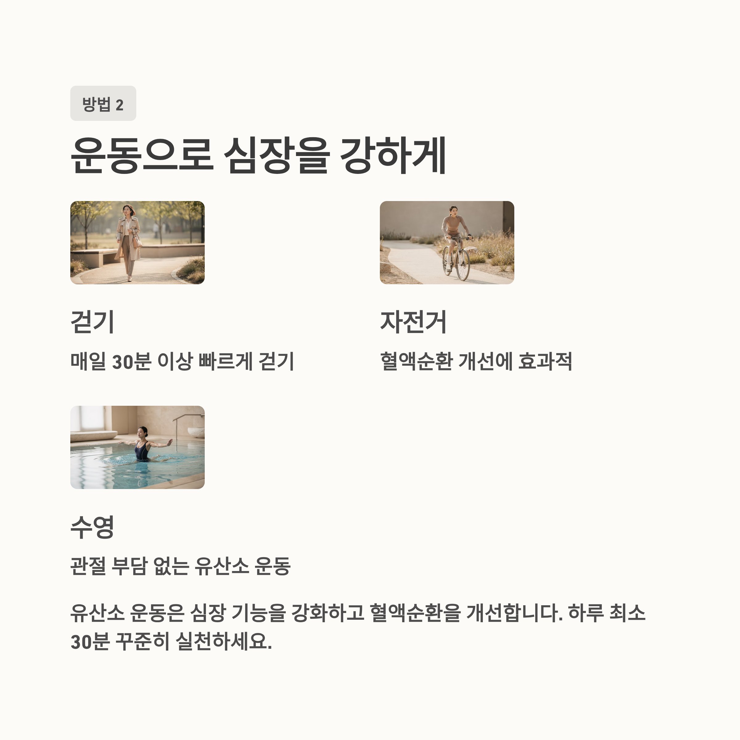 운동은 심혈관 건강 관리에서 빠질 수 없는 요소입니다. 특히 유산소 운동은 혈액순환을 개선하고 심장 기능을 강화하는 데 큰 도움이 됩니다. 걷기, 자전거 타기, 수영 등 꾸준히 할 수 있는 운동을 선택하는 것이 중요합니다.