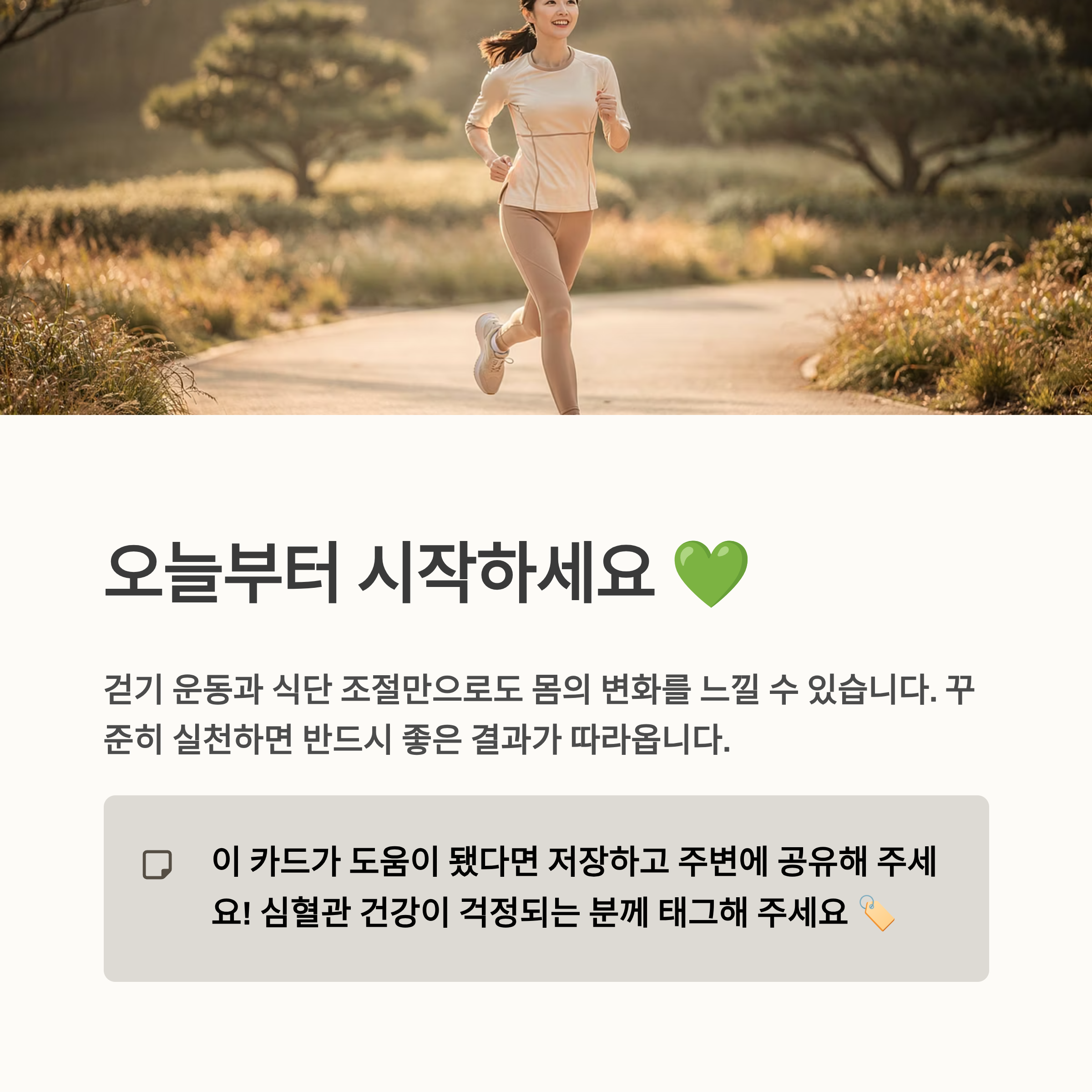 저 역시 예전에는 건강을 크게 신경 쓰지 않았지만, 작은 변화들을 하나씩 실천하면서 몸 상태가 달라지는 것을 느끼고 있습니다. 특히 걷기 운동과 식단 조절만으로도 큰 변화를 경험했습니다. 꾸준히 실천한다면 분명 좋은 결과가 따라올 것이라고 생각합니다.
