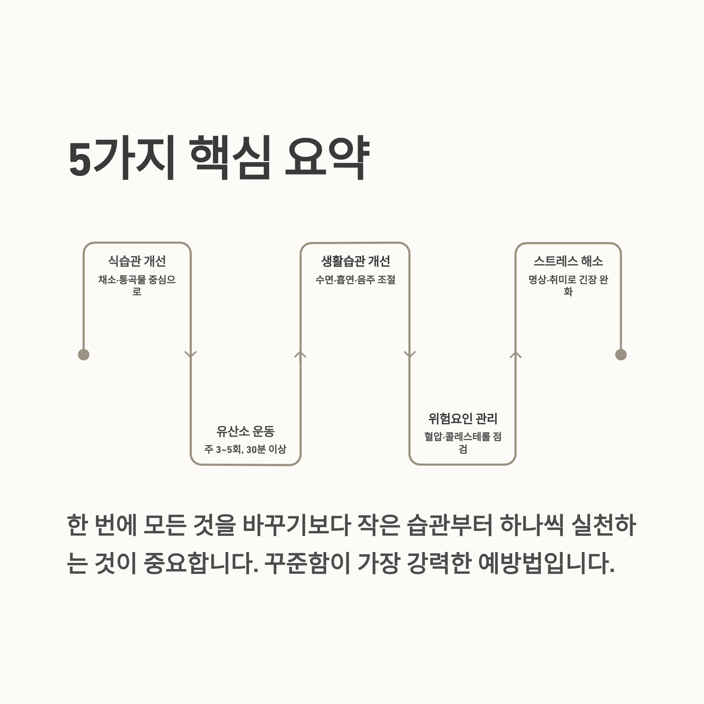 심혈관 건강은 단기간에 좋아지는 것이 아니라 꾸준한 관리가 필요한 영역입니다. 한 번에 많은 것을 바꾸기보다는 작은 습관부터 실천하는 것이 중요합니다. 식습관 개선, 규칙적인 운동, 충분한 수면을 기본으로 생활을 정비해보시길 권장드립니다.