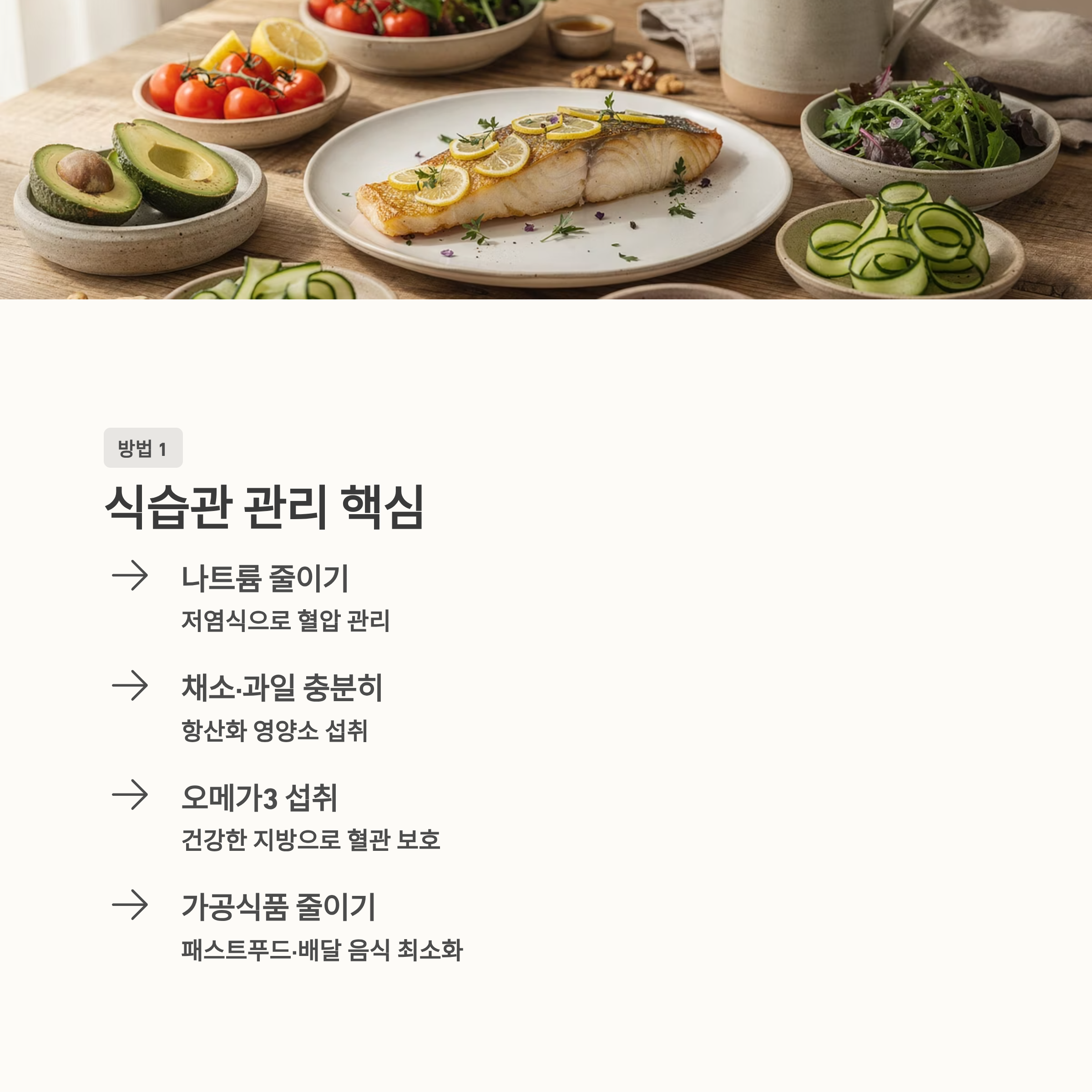심혈관 건강을 지키기 위해 가장 먼저 실천해야 할 것은 식습관 개선입니다. 포화지방과 나트륨 섭취를 줄이고, 채소와 과일을 충분히 섭취하는 것이 중요합니다. 특히 가공식품 섭취를 줄이는 것이 큰 도움이 됩니다.