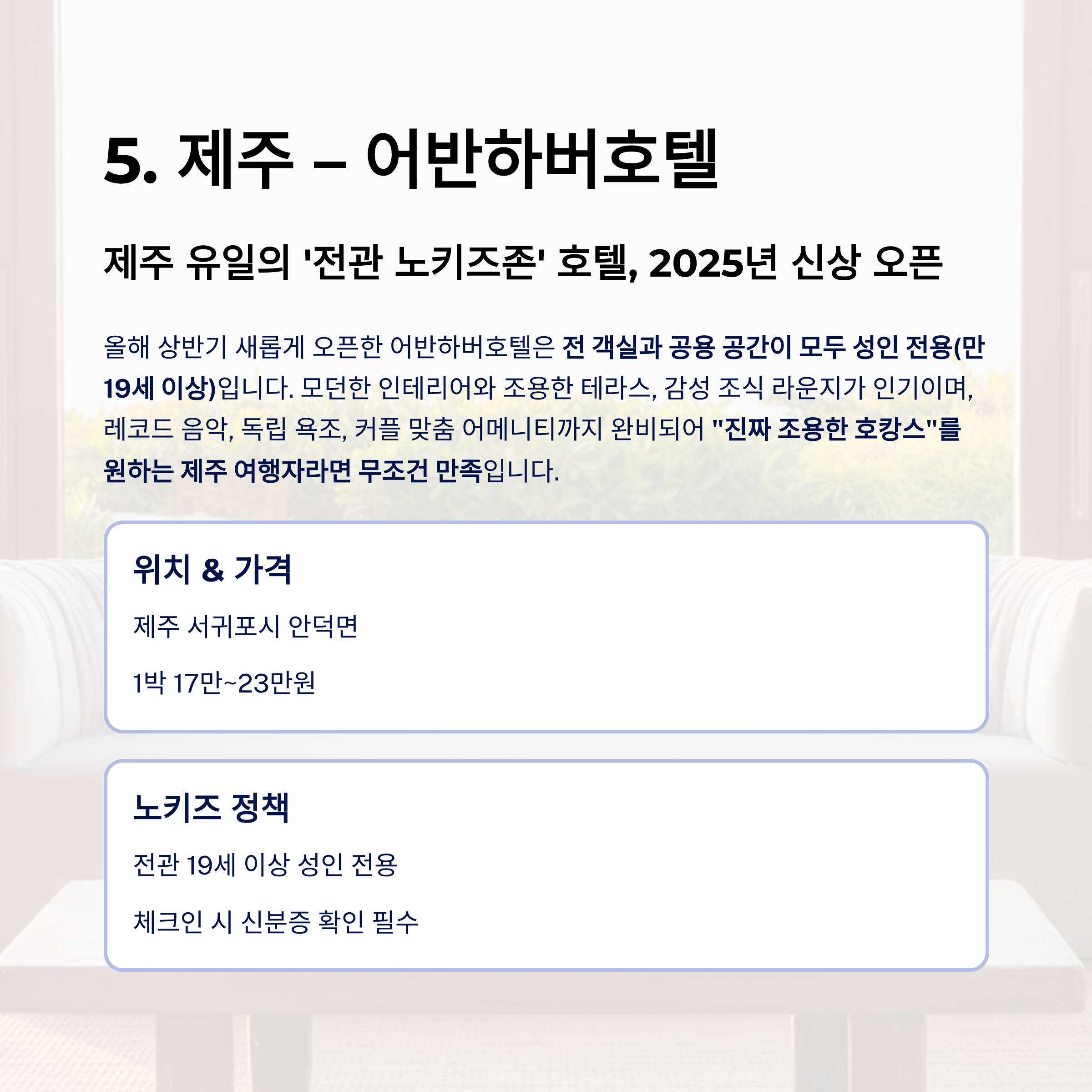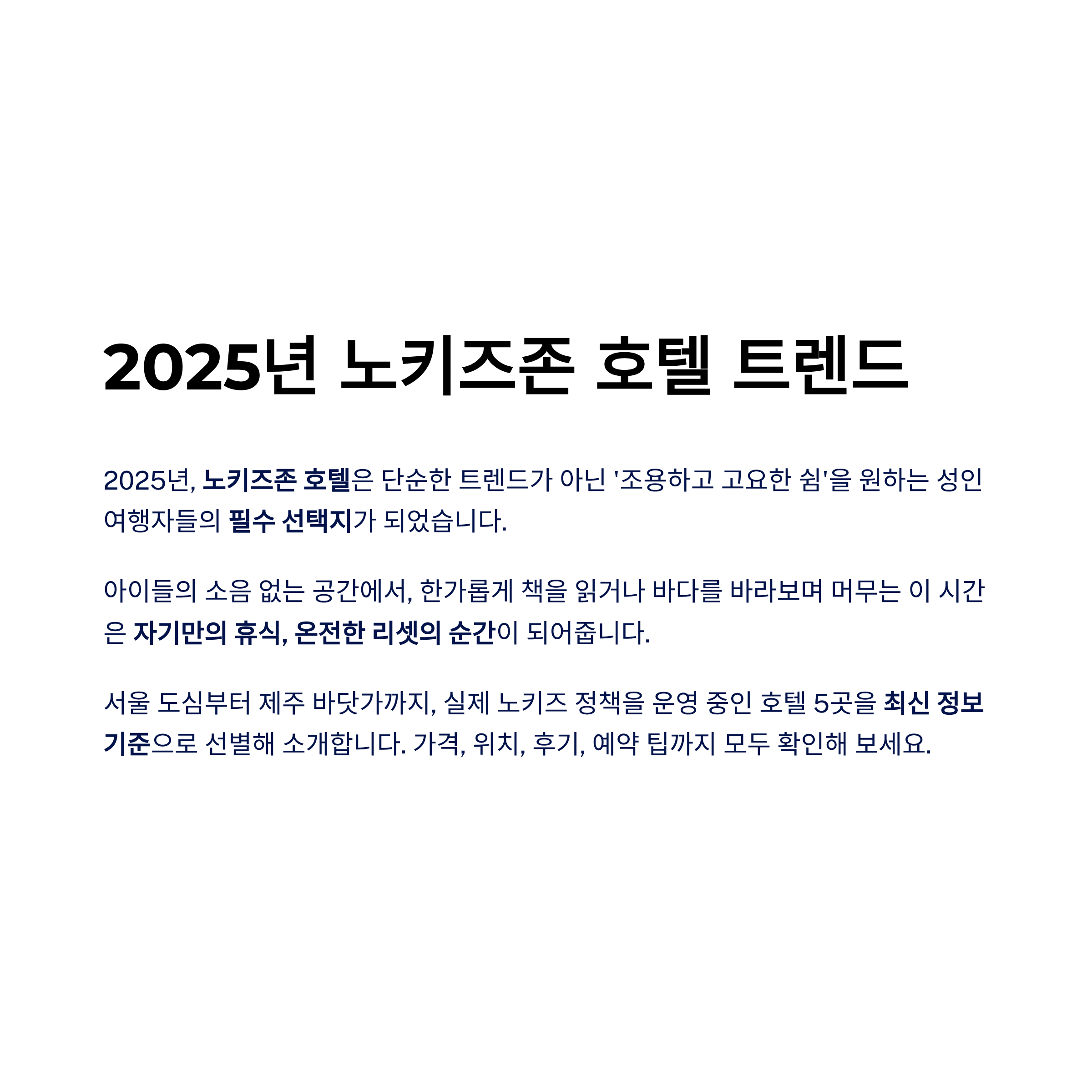 실제 노키즈 정책을 운영 중인 호텔 5곳을 최신 정보 기준으로 선별해 소개합니다.