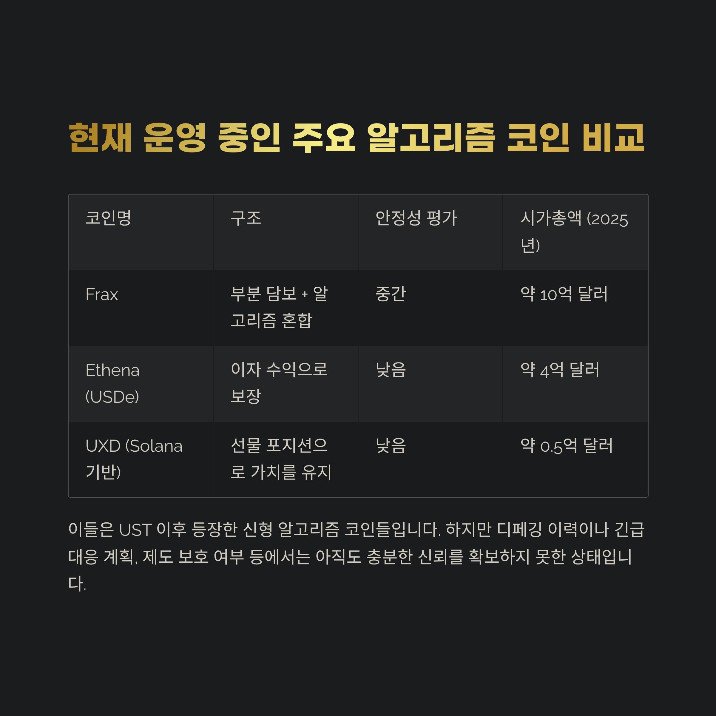 이 사건을 계기로, 투자자들 사이에서는 ‘알고리즘 스테이블코인’에 대한 경계가 크게 확산되었죠.
