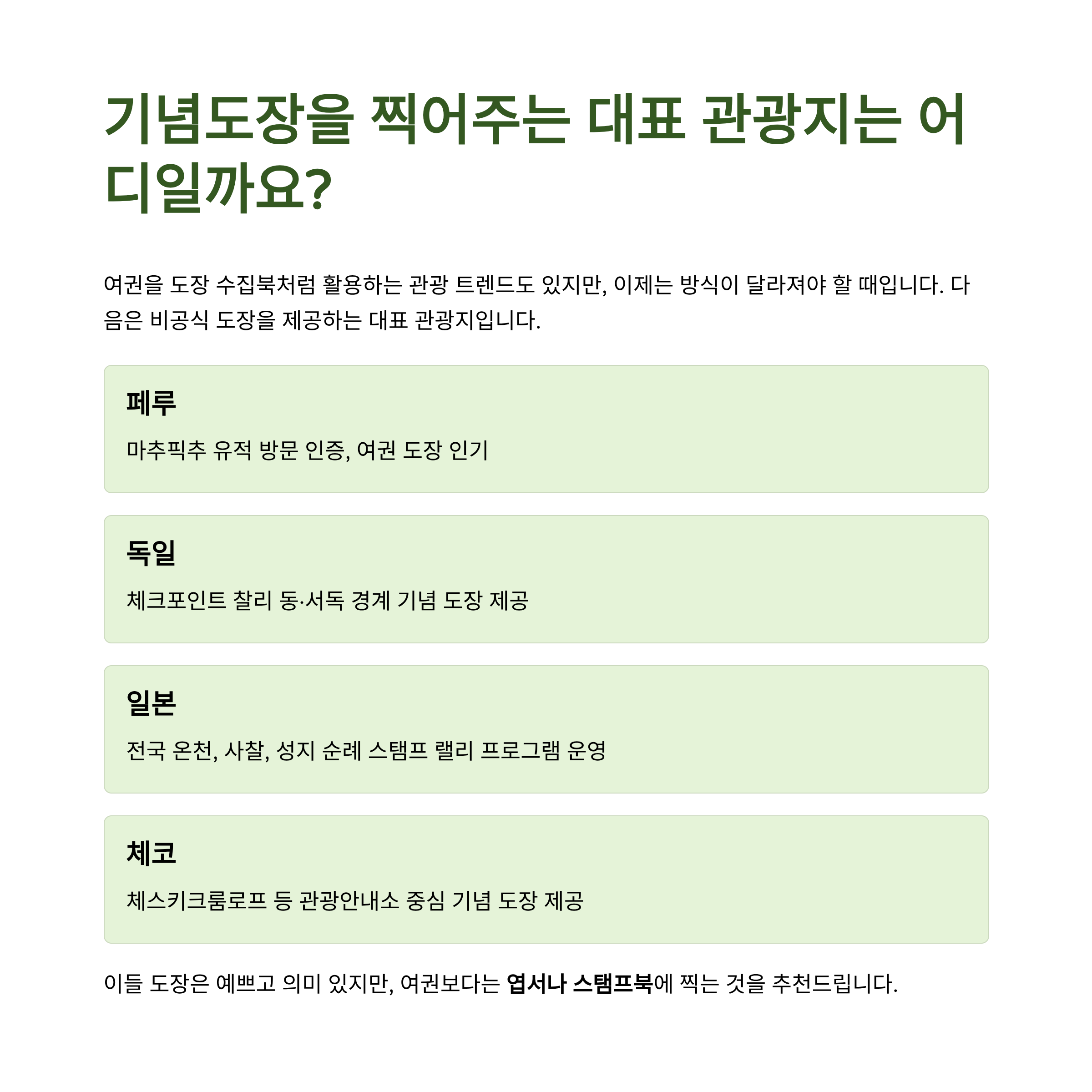 이제는 방식이 달라져야 할 때입니다. 다음은 비공식 도장을 제공하는 대표 관광지입니다.