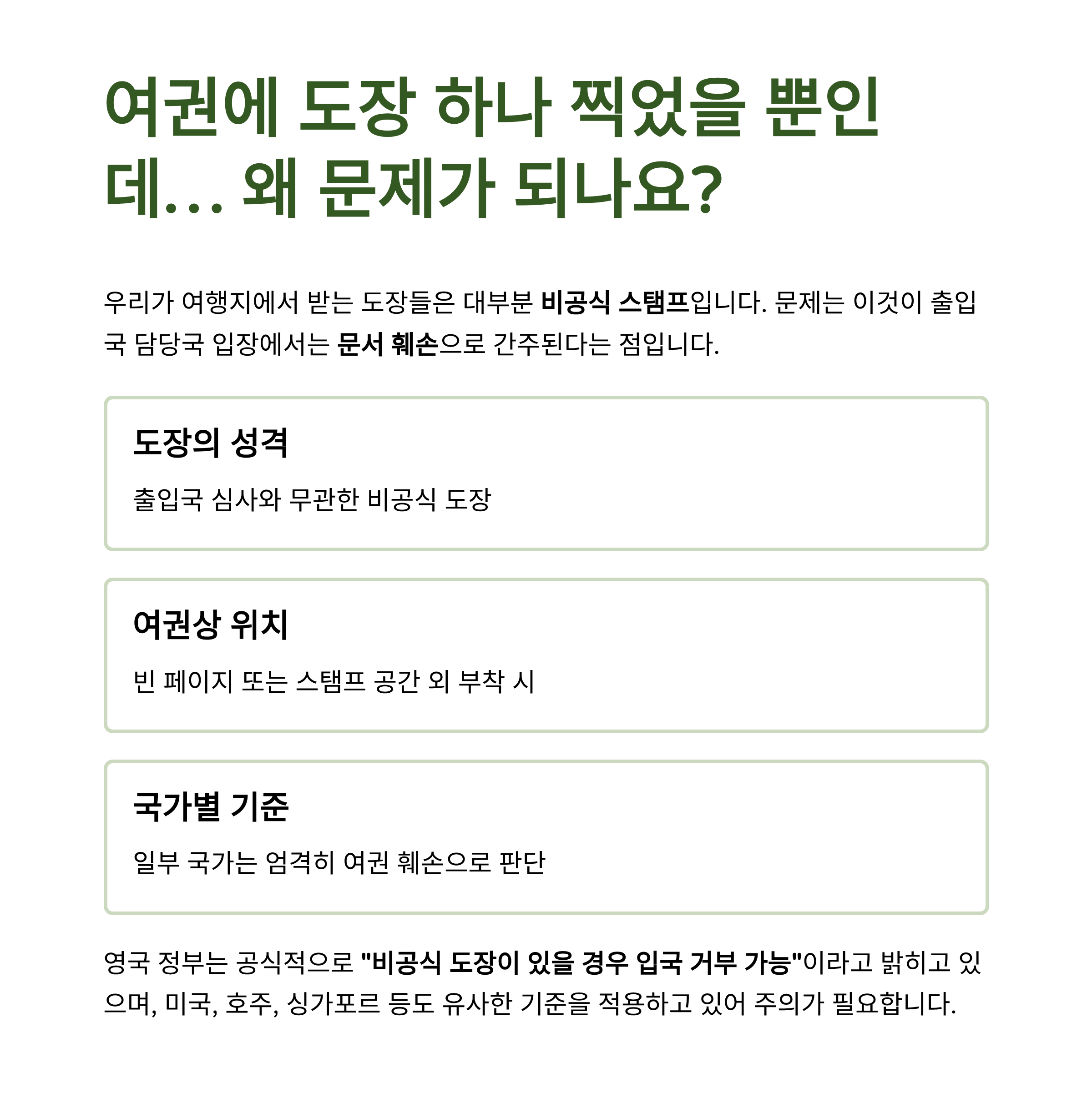 영국 정부는 공식적으로 **“비공식 도장이 있을 경우 입국 거부 가능”**이라고 밝히고 있으며,