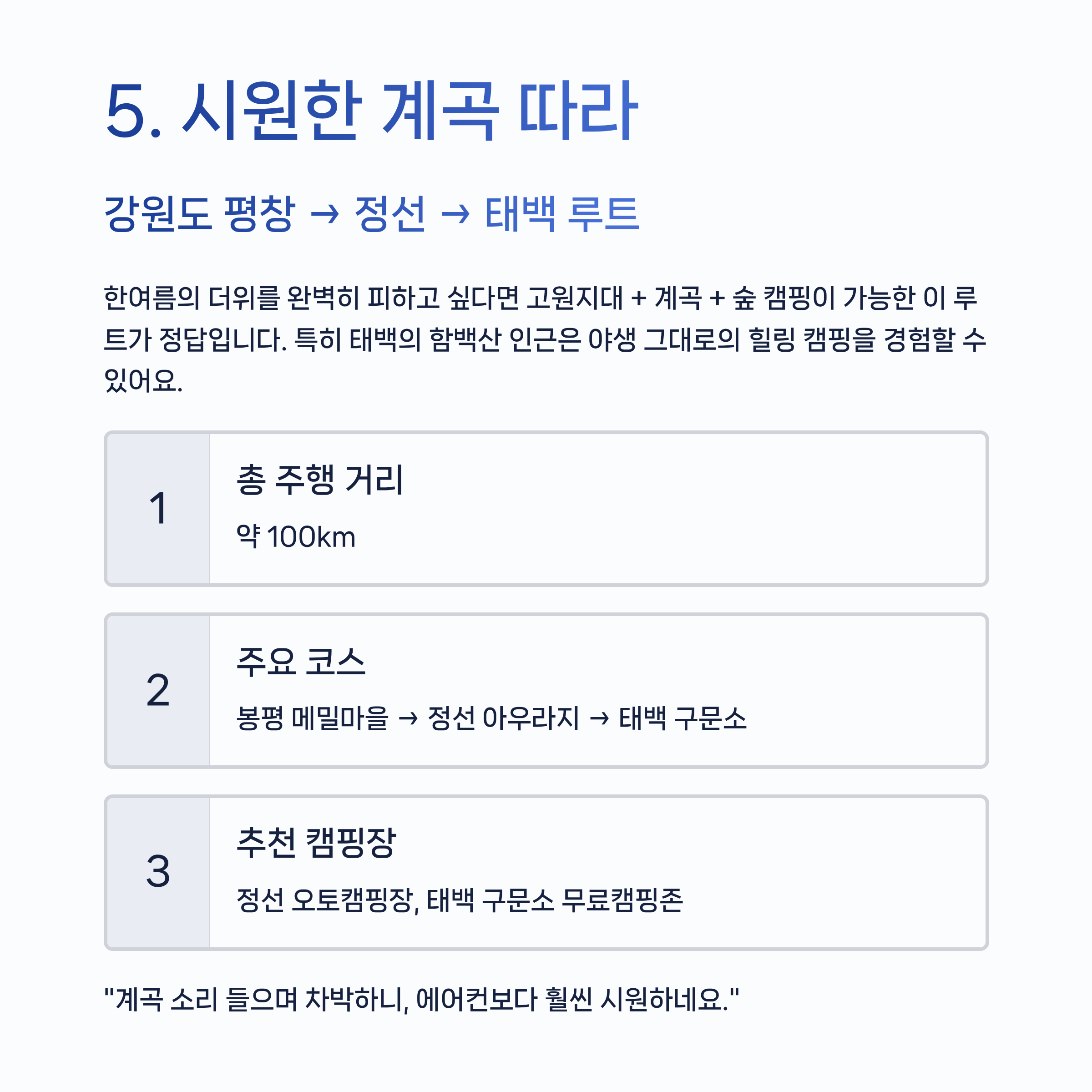 고원지대 + 계곡 + 숲 캠핑이 가능한 이 루트가 정답입니다.
