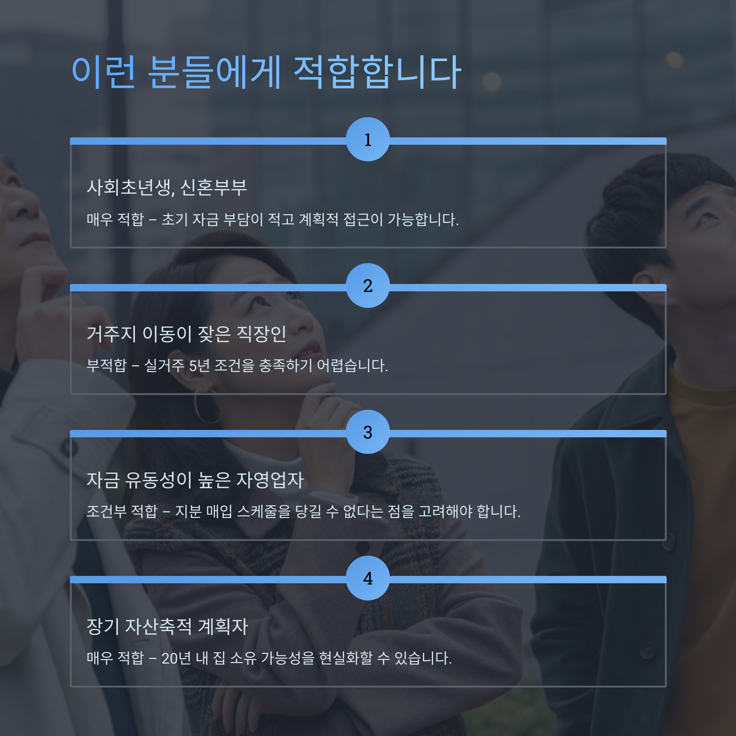 사회초년생, 신혼부부 매우 적합 – 초기 자금 부담 적고 계획적 접근 가능