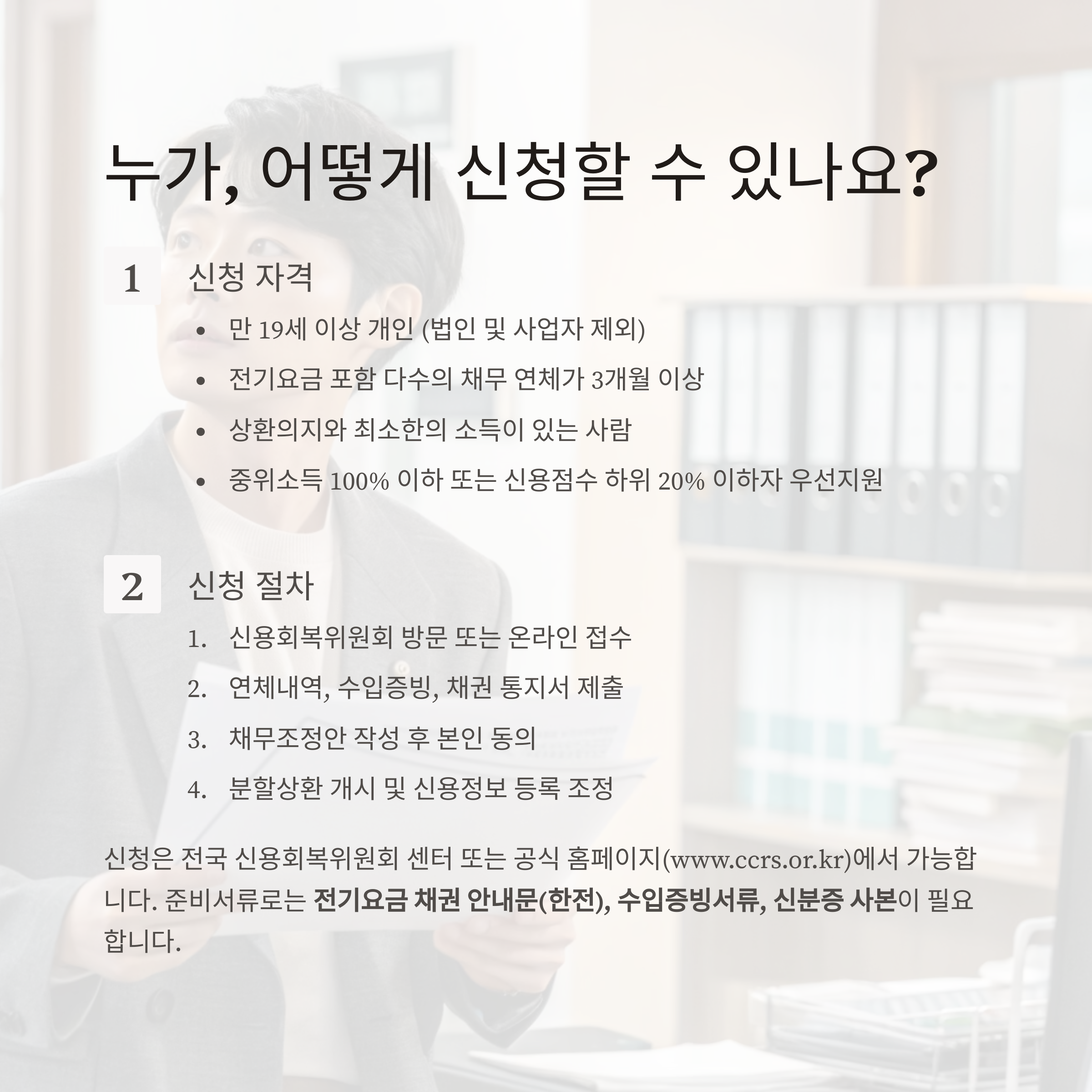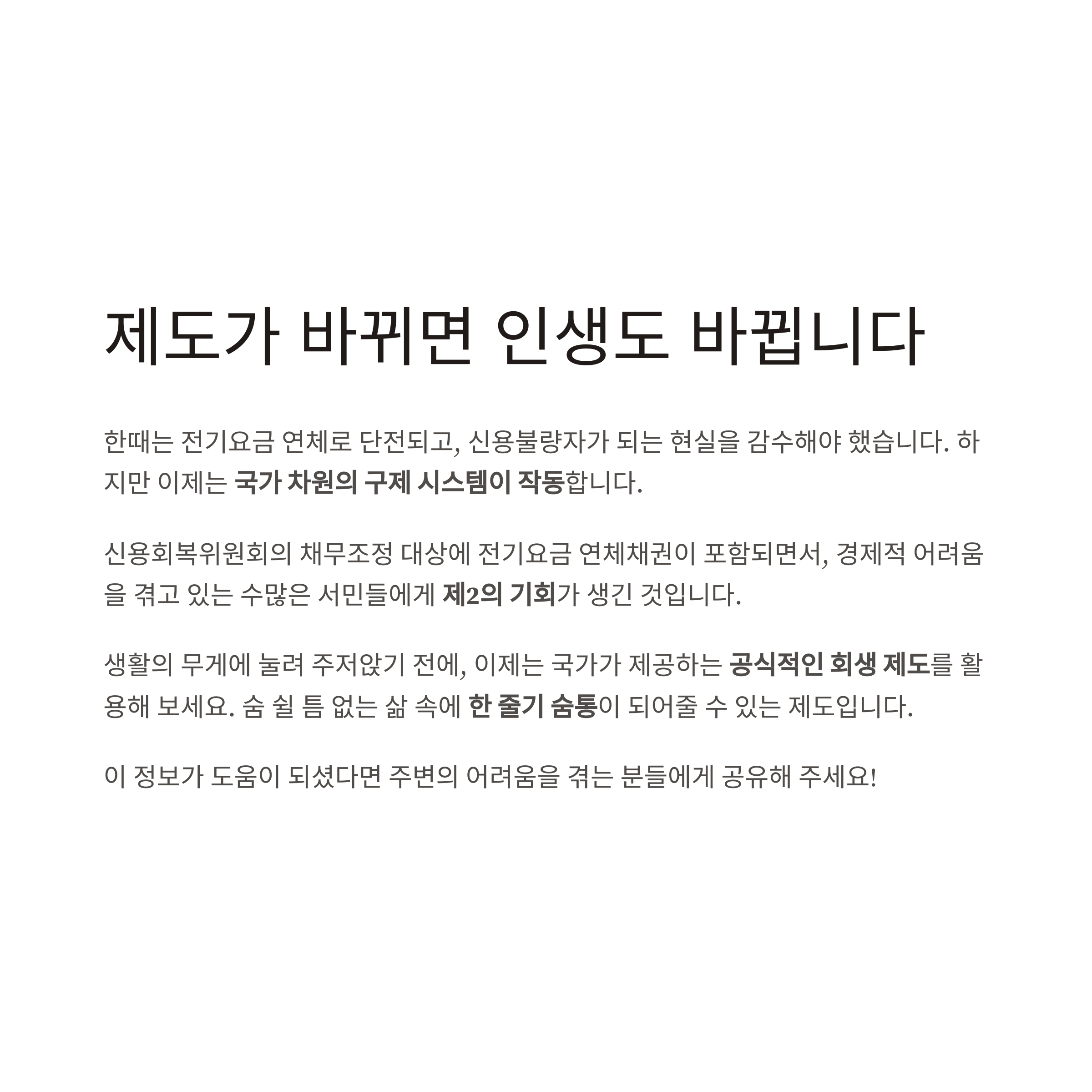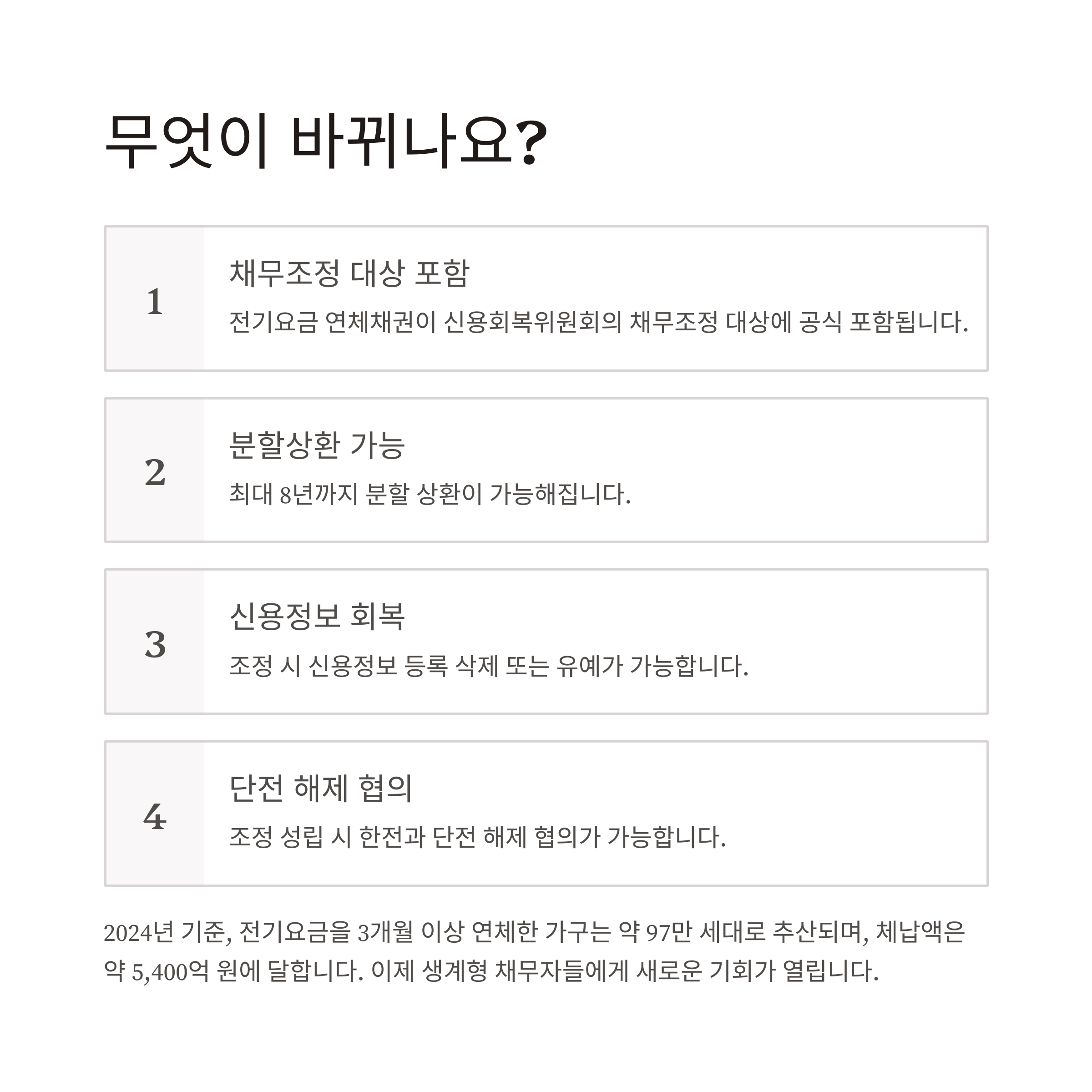즉, 이제는 전기요금 연체도 신용회복위원회를 통해 분할상환과 신용회복 절차를 진행할 수 있는 길이 열리게 된 것입니다.