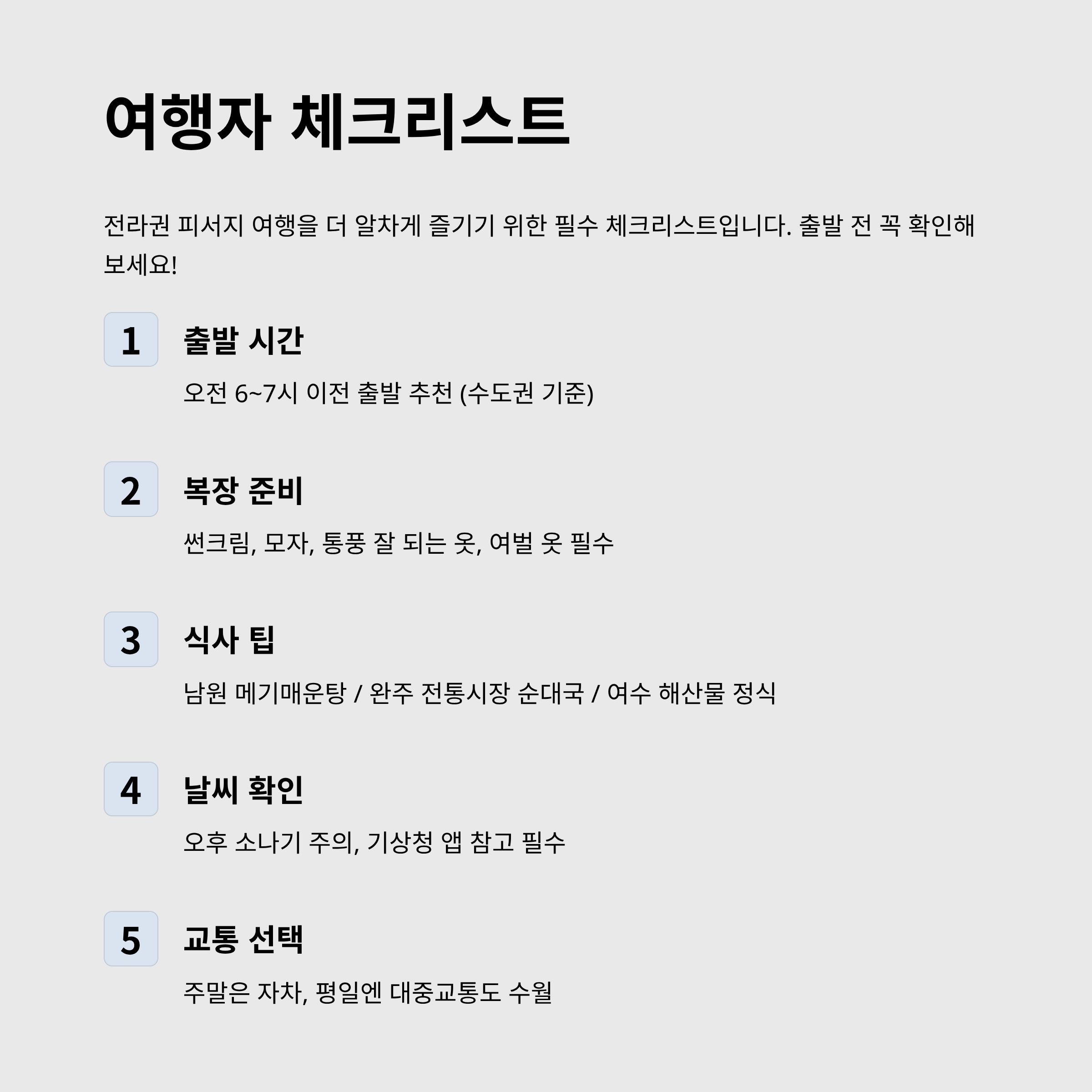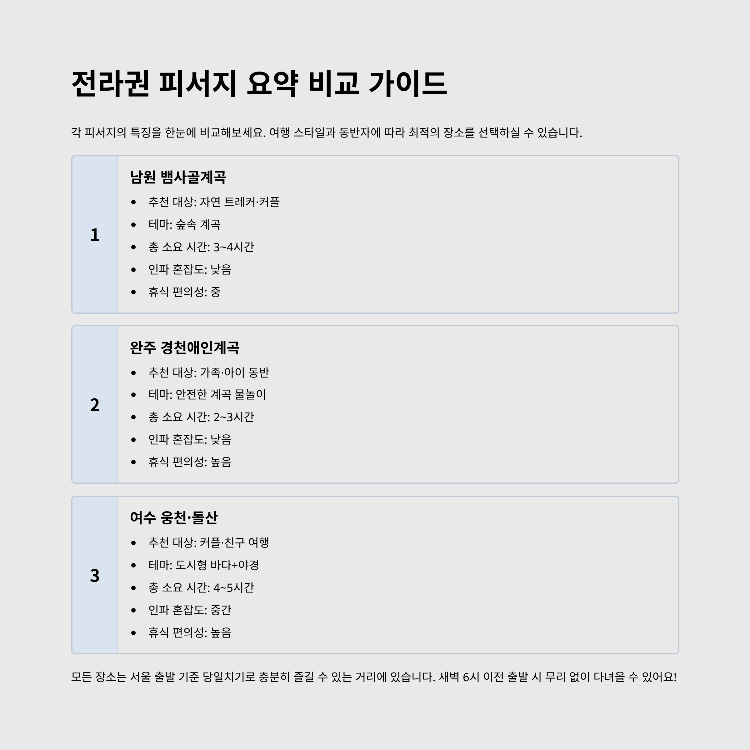 | 식사 팁 | 남원 메기매운탕 / 완주 전통시장 순대국 / 여수 해산물 정식 |