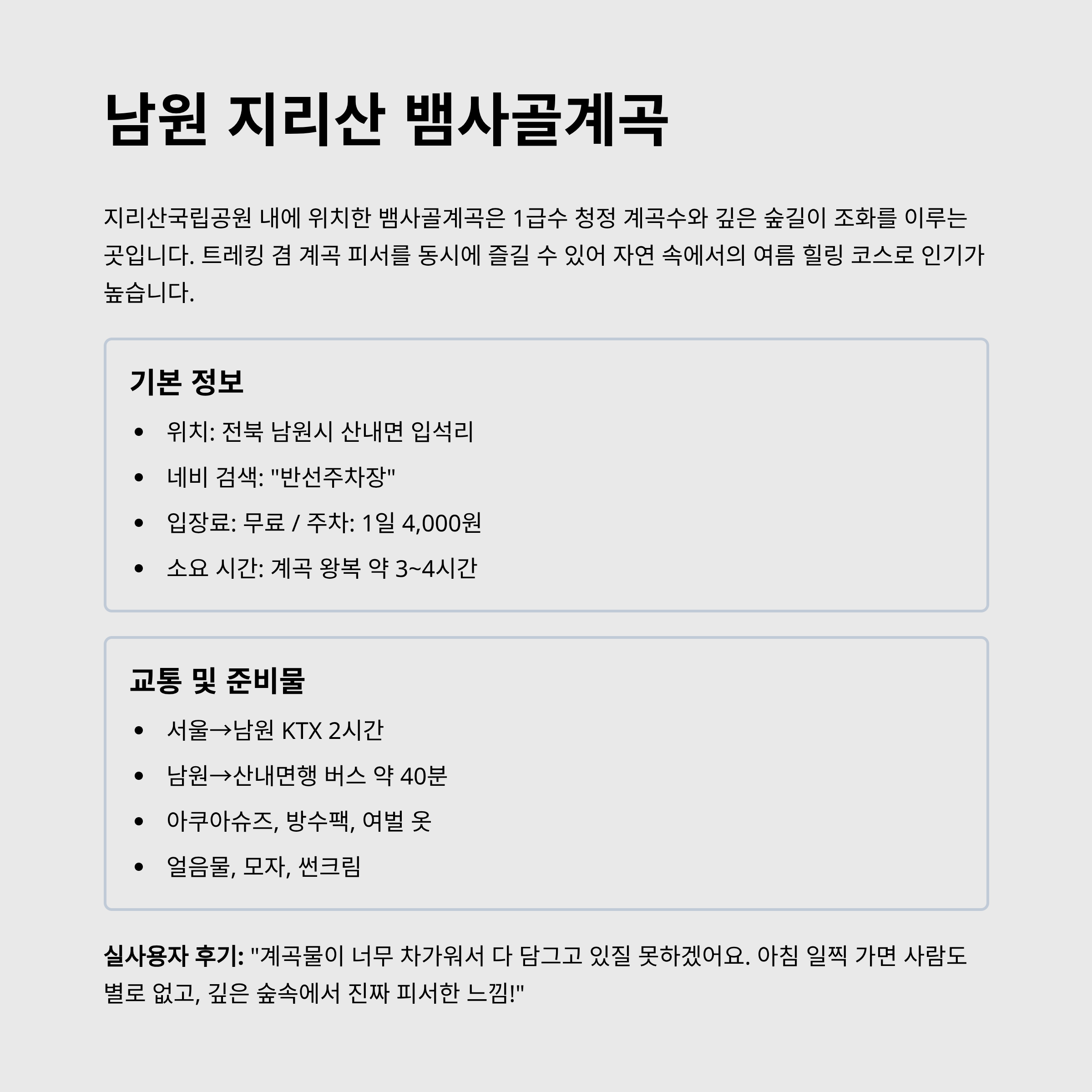 | 교통 팁 | 서울→남원 KTX 2시간 / 남원→산내면행 버스 약 40분 |