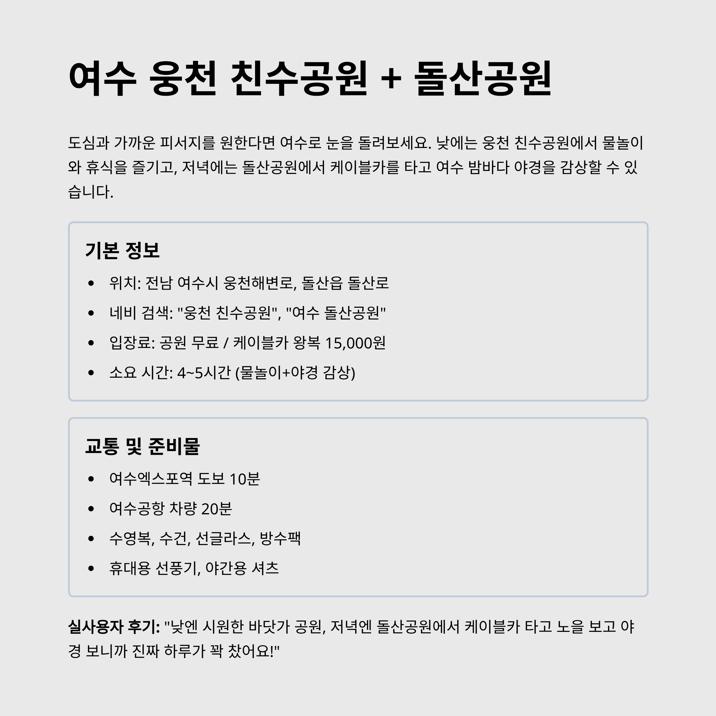 | 여수 웅천·돌산 | 커플·친구 여행 | 도시형 바다+야경 | 4~5시간 | 중간 | 높음 |