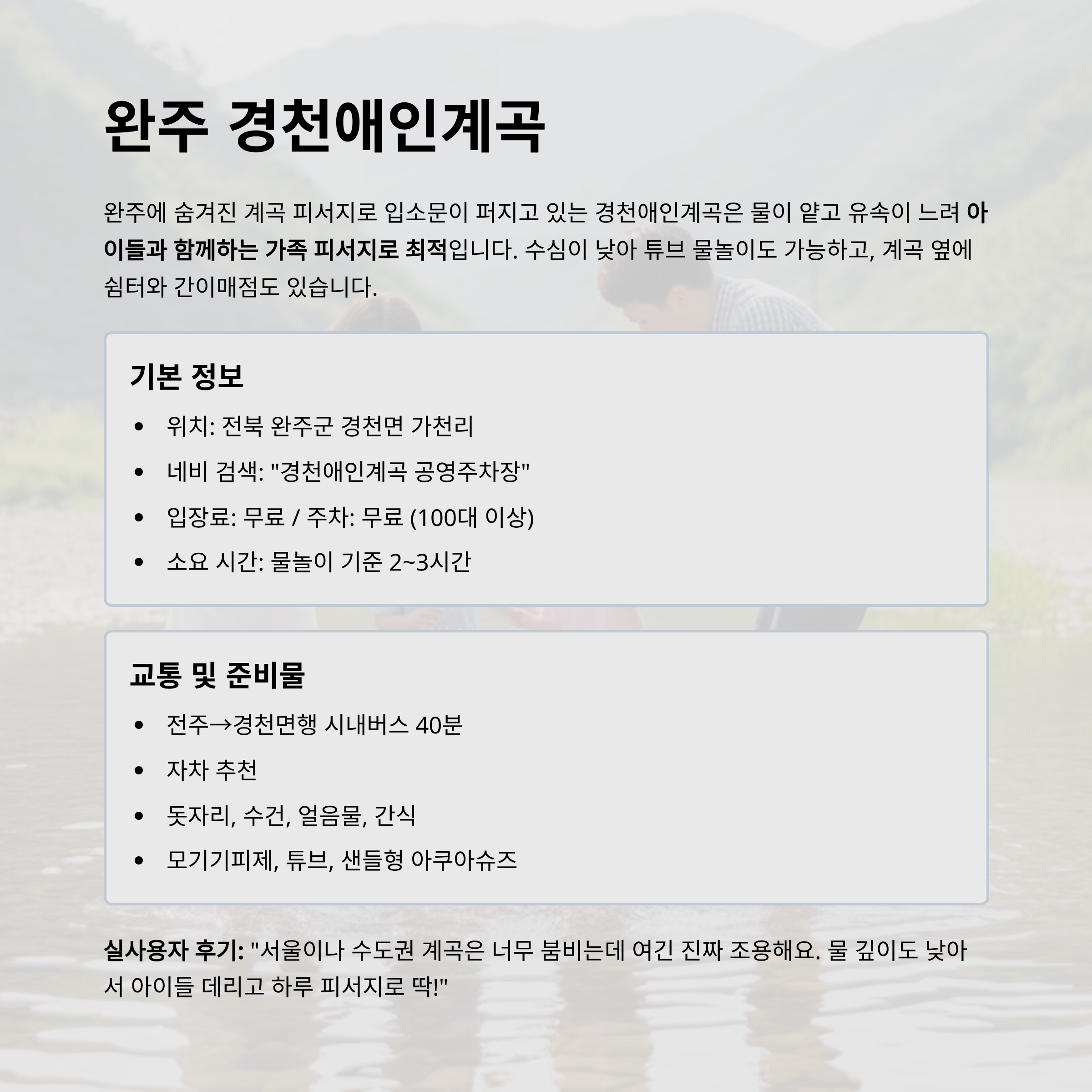 | 완주 경천애인계곡 | 가족·아이 동반 | 안전한 계곡 물놀이 | 2~3시간 | 낮음 | 높음 |