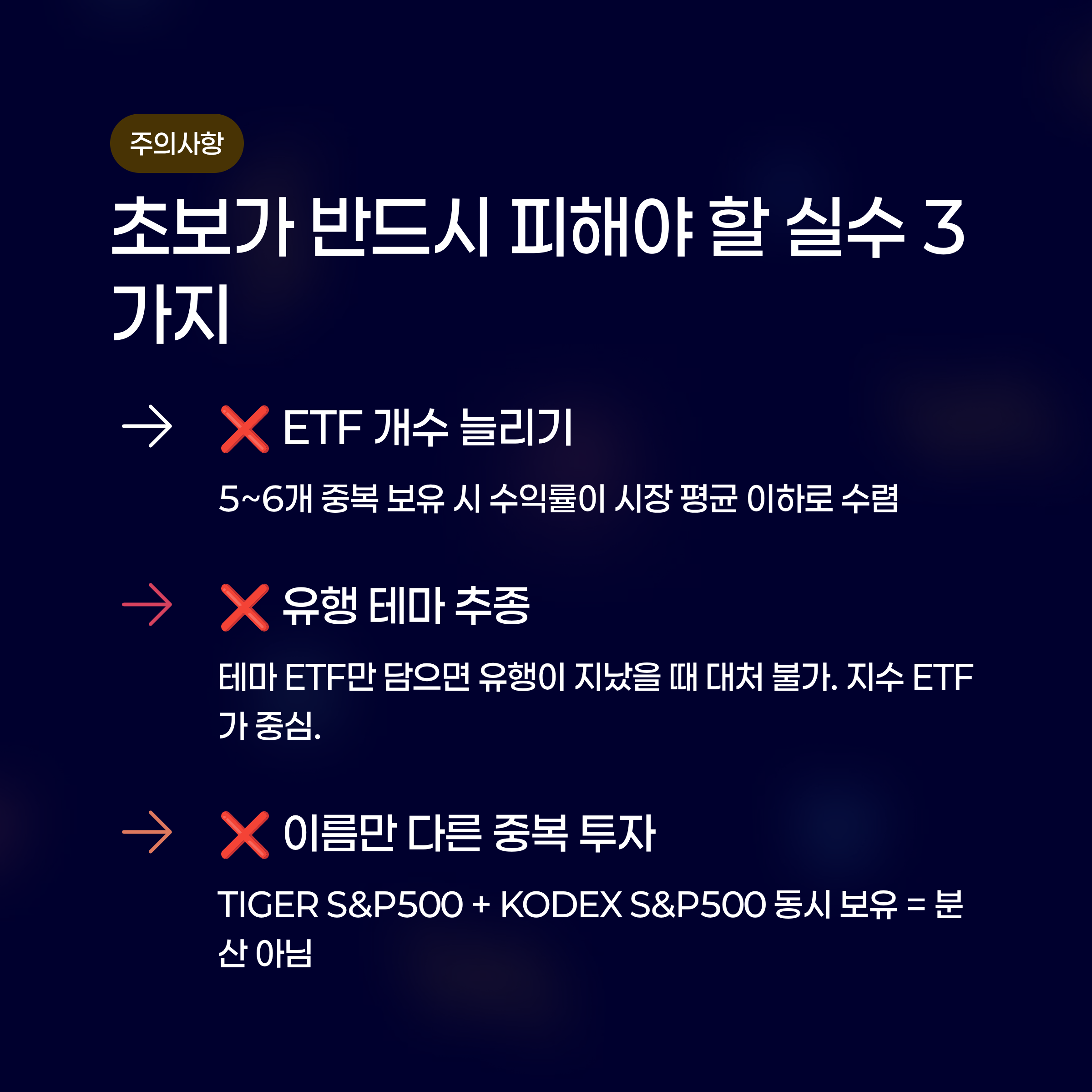 - 이름만 다른 중복 투자: 예를 들어 'TIGER 미국S&P500'과 'KODEX 미국S&P500'을 동시에 사는 것은 분산이 아닙니다. 운용사만 다를 뿐 담고 있는 주식은 똑같기 때문입니다.