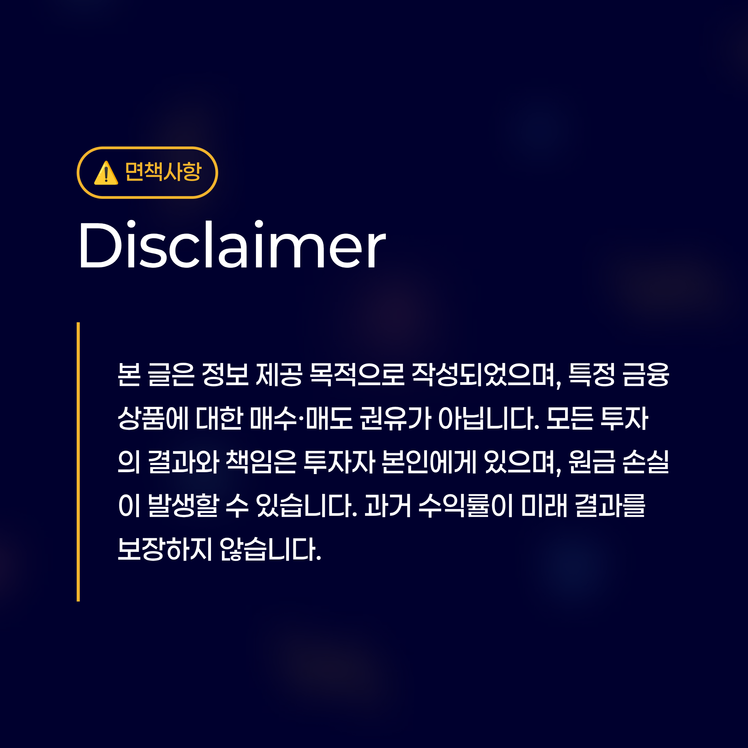 본 글은 정보 제공을 목적으로 작성되었으며, 특정 금융 상품에 대한 매수 또는 매도 권유가 아닙니다. 모든 투자의 결과와 책임은 투자자 본인에게 있으며, 시장 상황에 따라 원금 손실이 발생할 수 있습니다. 과거의 수익률이 미래의 결과를 보장하지 않습니다.