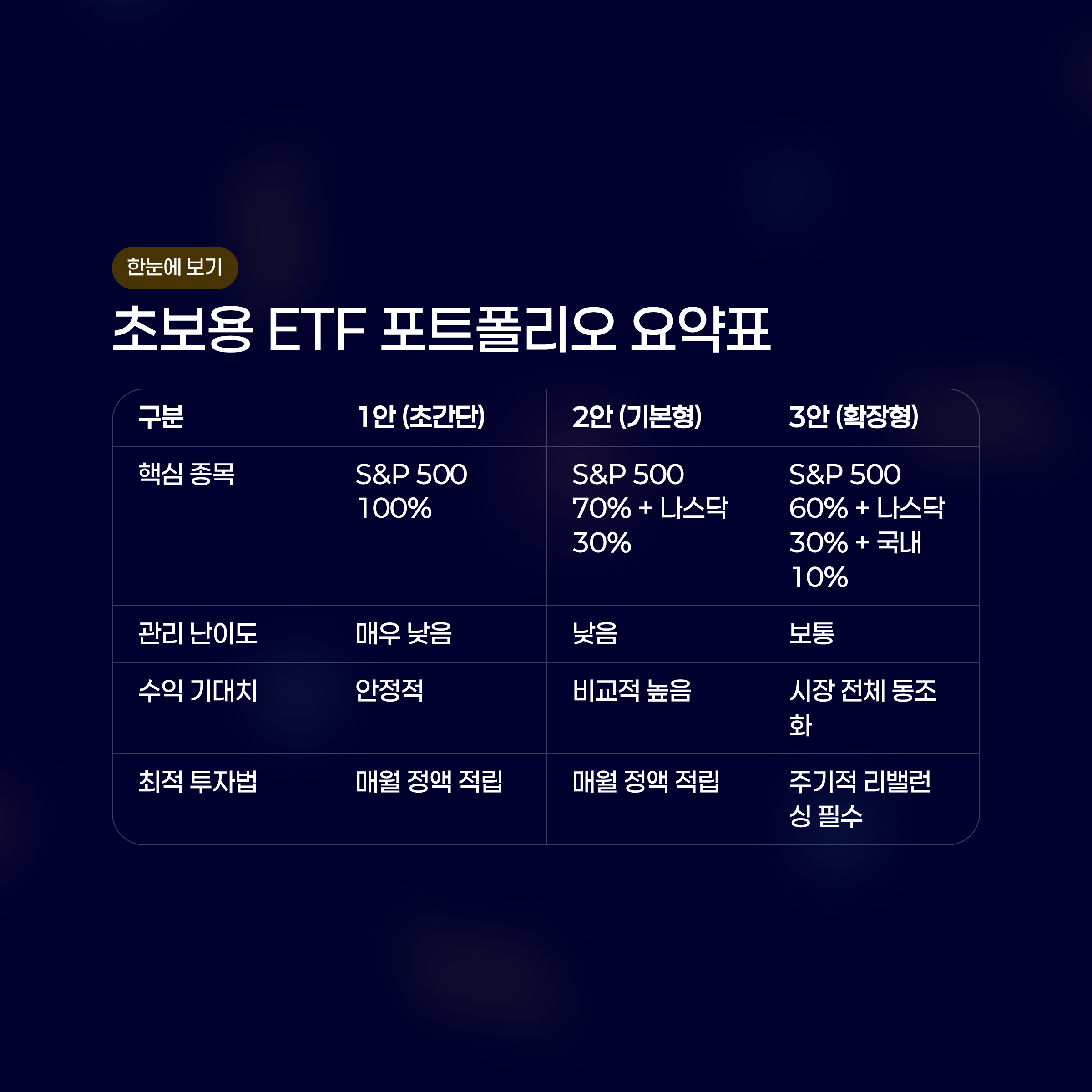 | 핵심 종목 | S&P 500 (100%) | S&P 500 (70%) + 나스닥 (30%) | S&P 500 (60%) + 나스닥 (30%) + 국내 (10%) |